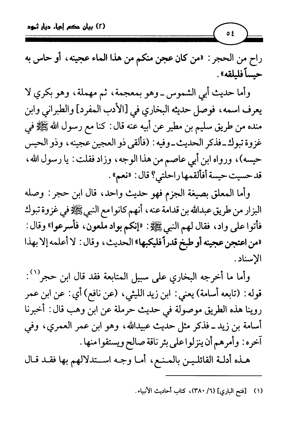 وأما المعلق بصيغة الجزم فهو حديث واحد، قال ابن حجر، وصله البزار من طريق عبد الله بن قدامة عنه، «أنهم كانوا مع النبي صلى الله عليه وسلم في غزوة تبوك، فأتوا على واد، فقال لهم النبي صلى الله عليه وسلم إنكم بواد ملعون، فأسرعوا وقال: من اعتجن عجينة أو طبخ قدرا فليكبها» الحديث، وقال: لا أعلمه إلا بهذا الإسناد.