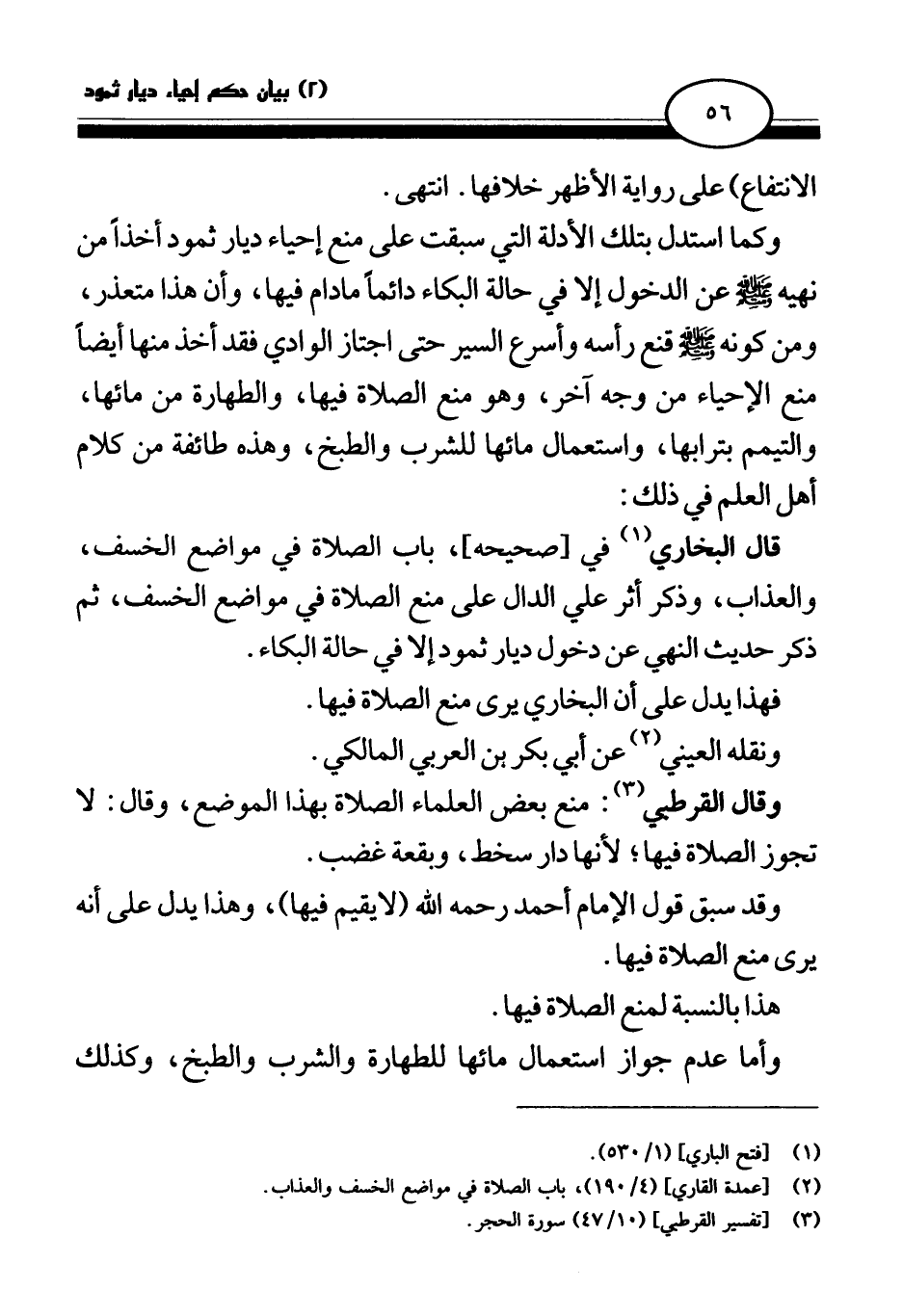 وكما استدل بتلك الأدلة التي سبقت على منع إحياء ديار ثمود أخذا من نهيه صلى الله عليه وسلم عن الدخول إلا في حالة البكاء دائما ما دام فيها، وأن هذا متعذر، ومن كونه صلى الله عليه وسلم قنع رأسه وأسرع السير حتى اجتاز الوادي فقد أخذ منها أيضا منع الأحياء من وجه آخر، وهو منع الصلاة فيها، والطهارة من مائها، والتيمم بترابها، واستعمال مائها للشرب والطبخ، وهذه الطائفة من كلام أهل العلم في ذلك: