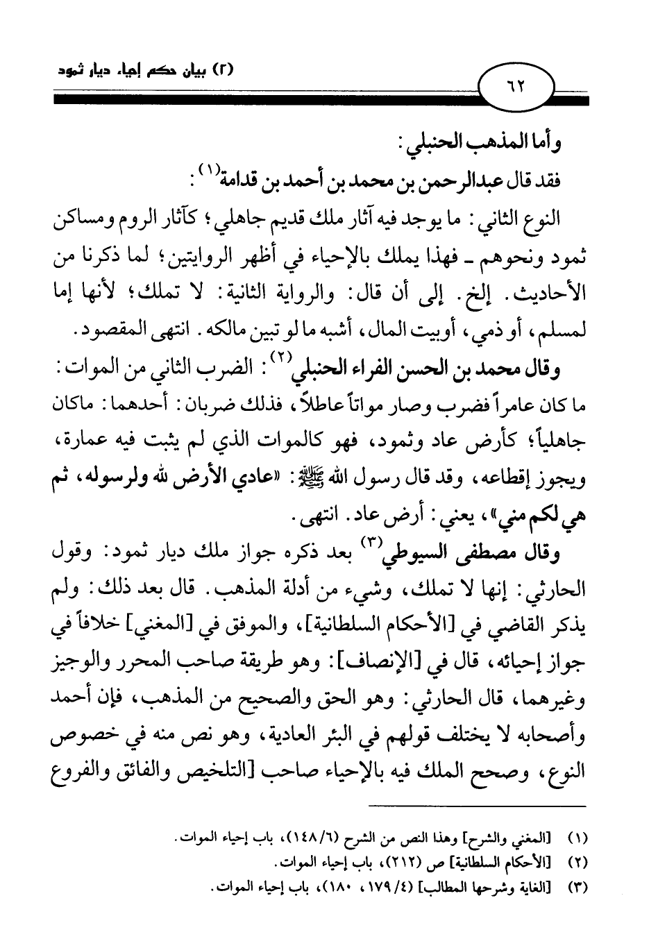 وقال مصطفى السيوطي: (¬3) بعد ذكره جواز ملك ديار ثمود، وقول الحارثي: إنها لا تملك، وشيء من أدلة المذهب، وقال بعد ذلك: ولم يذكر القاضي في [الأحكام السلطانية] ، والموفق في [المغني] خلافا في جواز إحيائه، قال في [الإنصاف] : وهو طريقة صاحب المحرر والوجيز وغيرهما، قال الحارثي: وهو الحق والصحيح من المذهب، فإن أحمد وأصحابه لا يختلف قولهم في البئر العادية، وهو نص منه في خصوص النوع، وصحح الملك فيه بالإحياء صاحب [التلخيص والفائق والفروع