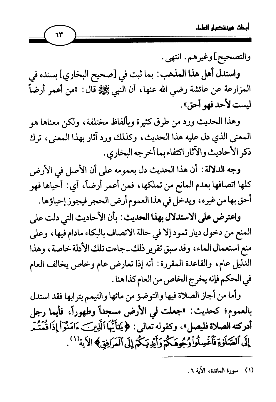 وأما من أجاز الصلاة فيها، والتوضؤ من مائها والتيمم بترابها فقد استدل بالعموم؛ كحديث: «جعلت لي الأرض مسجدا وطهورا، فأيما رجل أدركته الصلاة فليصل (¬2) » ، وكقوله تعالى: {يَا أَيُّهَا الَّذِينَ آمَنُوا إِذَا قُمْتُمْ إِلَى الصَّلَاةِ فَاغْسِلُوا وُجُوهَكُمْ وَأَيْدِيَكُمْ إِلَى الْمَرَافِقِ} (¬3) الآية.