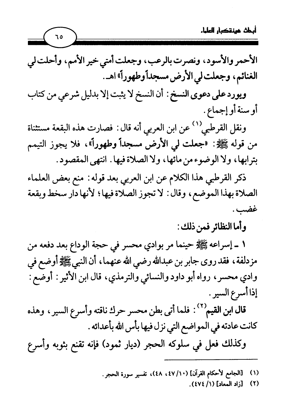 قال ابن القيم (¬5) : فلما أتى بطن محسر حرك ناقته وأسرع السير، وهذه كانت عادته في المواضع التي نزل فيها بأس الله بأعدائه.