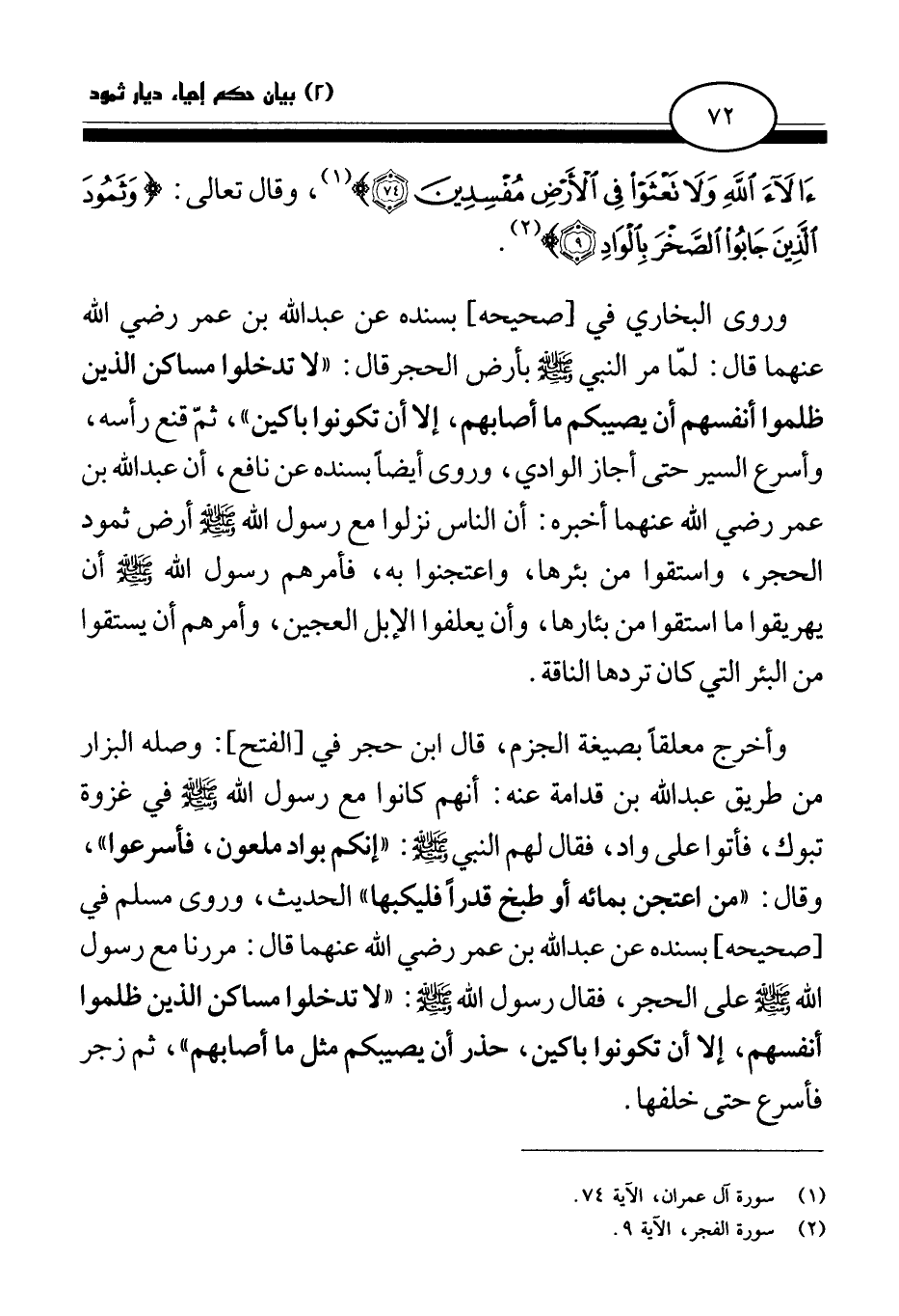 وروى البخاري في [صحيحه] بسنده عن عبد الله بن عمر رضي الله عنهما قال: «لما مر النبي صلى الله عليه وسلم بأرض الحجر قال: لا تدخلوا مساكن الذين ظلموا أنفسهم أن يصيبكم ما أصابهم، إلا أن تكونوا باكين. ثم قنع رأسه، وأسرع السير حتى أجاز الوادي (¬2) » ، وروى أيضا بسنده عن نافع، أن عبد الله بن عمر رضي الله عنهما أخبره: «أن الناس نزلوا مع رسول الله صلى الله عليه وسلم أرض ثمود الحجر، واستقوا من بئرها، واعتجنوا به، فأمرهم رسول الله صلى الله عليه وسلم أن يهريقوا ما استقوا من بئارها، وأن يعلفوا الإبل العجين، وأمرهم أن يستقوا من البئر التي كان تردها الناقة (¬3) » .