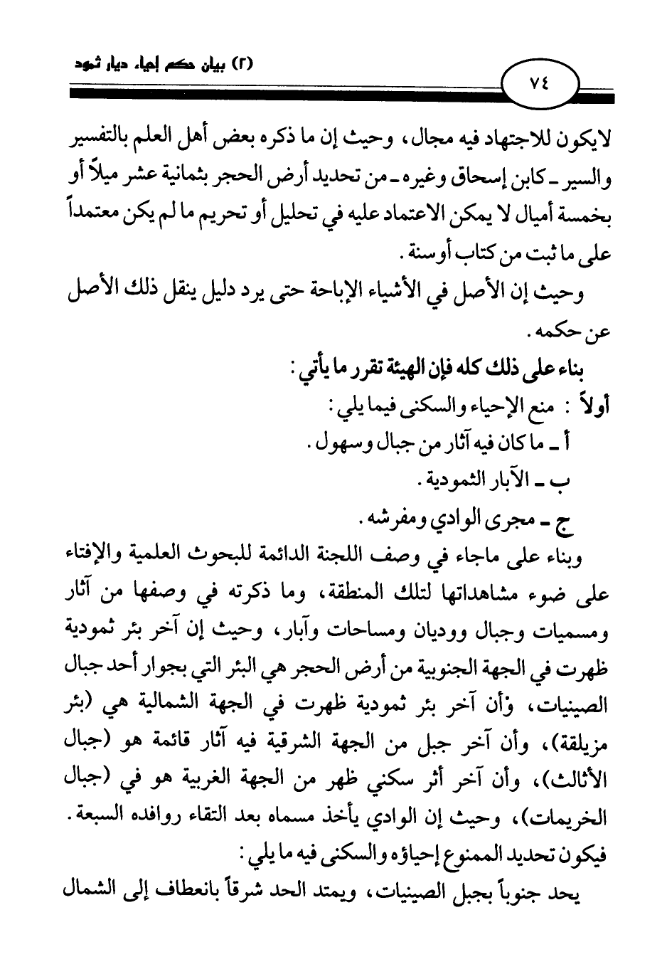 وبناء على ما جاء في وصف اللجنة الدائمة للبحوث العلمية والإفتاء على ضوء مشاهداتها لتلك المنقطة، ما ذكرته في وصفها من آثار ومسميات وجبال ووديان ومساحات وآبار، وحيث إن آخر بئر ثمودية ظهرت في الجهة الجنوبية من أرض الحجر هي البئر التي بجوار أحد جبال الصينيات، وأن آخر بئر ثمودية ظهرت في الجهة الشمالية هي (بئر مزيلقة) وأن آخر جبل من الجهة الشرقية فيه آثار قائمة هو (جبال الأثالث) وأن آخر أثر سكني ظهر في الجهة الغربية هو في (جبال الخريمات) وحيث إن الوادي يأخذ مسماه بعد التقاء روافده السبعة، فيكون تحديد الممنوع إحياؤه والسكني فيما يلي: