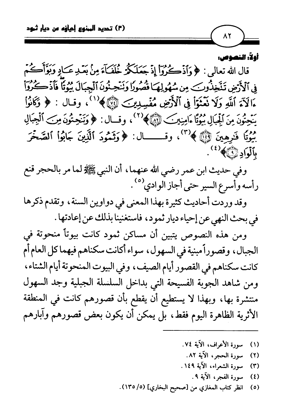 قال الله تعالى {وَاذْكُرُوا إِذْ جَعَلَكُمْ خُلَفَاءَ مِنْ بَعْدِ عَادٍ وَبَوَّأَكُمْ فِي الْأَرْضِ تَتَّخِذُونَ مِنْ سُهُولِهَا قُصُورًا وَتَنْحِتُونَ الْجِبَالَ بُيُوتًا فَاذْكُرُوا آلَاءَ اللَّهِ وَلَا تَعْثَوْا فِي الْأَرْضِ مُفْسِدِينَ} (¬1) وقال: {وَكَانُوا يَنْحِتُونَ مِنَ الْجِبَالِ بُيُوتًا آمِنِينَ} (¬2) وقال {وَتَنْحِتُونَ مِنَ الْجِبَالِ بُيُوتًا فَارِهِينَ} (¬3) وقال: {وَثَمُودَ الَّذِينَ جَابُوا الصَّخْرَ بِالْوَادِ} (¬4)