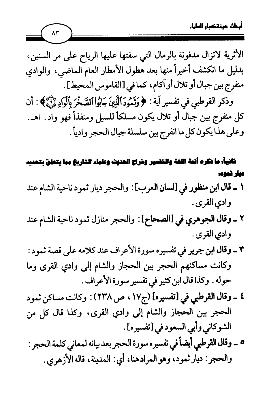 5 - وقال القرطبي أيضا في تفسيره سورة الحجر بعد بيانه لمعاني كلمة الحجر: والحجر: ديار ثمود، وهو المراد هنا، أي: المدينة، وقال الأزهري