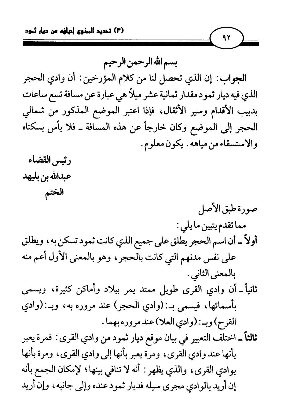 الجواب: إن الذي تحصل لنا من كلام المؤرخين: أن وادي الحجر الذي فيه ديار ثمود مقدار ثمانية عشر ميلا هي عبارة عن مسافة تسعة ساعات بدبيب الأقدام وسير الأثقال، فإذا اعتبر المواضع المذكور من شمالي الحجر إلى الموضع وكان خارجا عن هذه المسافة - فلا بأس بسكناه والاستسقاء من مياهه. يكون معلوما.