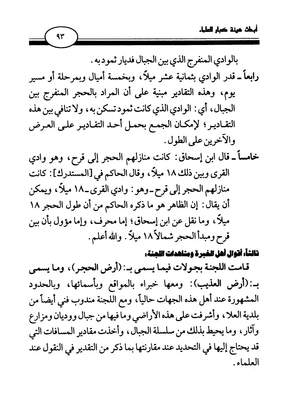 رابعا - قدر الوادي بثمانية عشر ميلا، وبخمسة أميال وبمرحلة أو مسير يوم، وهذه التقادير مبنية على أن المراد بالحجر المنفرج بين الجبال، أي: الوادي الذي كانت ثمود تسكن به، ولا تنافي بين هذه التقادير؛ لإمكان الجمع بحمل أحد التقادير على العرض والآخرين على الطول.