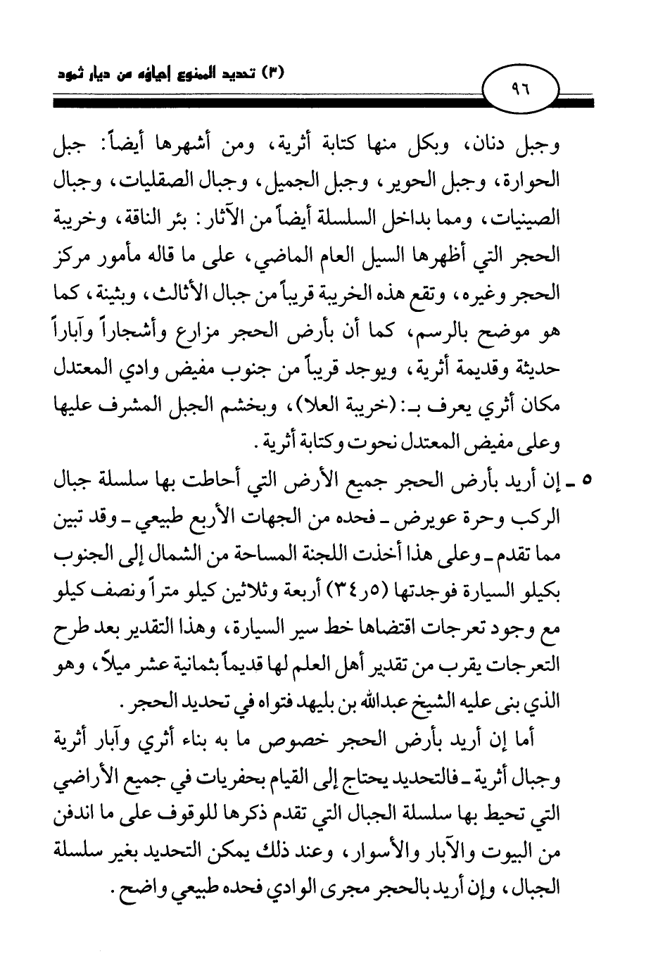 5 - إن أريد بأرض الحجر جميع الأرض التي أحاطت بها سلسلة جبال الركب وحرة عويرض - فحده من الجهات الأربع طبيعي - وقد تبين مما تقدم - وعلى هذا أخذت اللجنة المساحة من الشمال إلى الجنوب بكيلو السيارة فوجدتها (34.5) أربعة وثلاثين كيلو مترا ونصف كيلو مع وجود تعرجات اقتضاها خط سير السيارة، وهذا التقدير بعد طرح التعرجات يقرب من تقدير أهل العلم لها قديما بثمانية عشر ميلا، وهو الذي بنى عليه الشيخ عبد الله بن بليهد فتواه في تحديد الحجر.