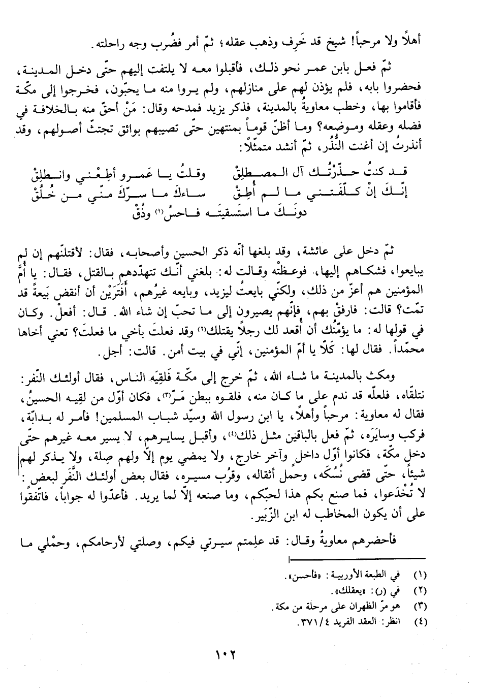 وَمَكَثَ بِالْمَدِينَةِ مَا شَاءَ اللَّهُ ثُمَّ خَرَجَ إِلَى مَكَّةَ فَلَقِيَهُ النَّاسُ، فَقَالَ أُولَئِكَ النَّفَرُ: نَتَلَقَّاهُ فَلَعَلَّهُ قَدْ نَدِمَ عَلَى مَا كَانَ مِنْهُ، فَلَقُوهُ بِبَطْنِ مَرَّ، فَكَانَ أَوَّلَ مَنْ لَقِيَهُ الْحُسَيْنُ، فَقَالَ لَهُ مُعَاوِيَةُ: مَرْحَبًا وَأَهْلًا يَا ابْنَ رَسُولِ اللَّهِ وَسَيِّدَ شَبَابِ الْمُسْلِمِينَ، فَأَمَرَ لَهُ بِدَابَّةٍ فَرَكِبَ وَسَايَرَهُ، ثُمَّ فَعَلَ بِالْبَاقِينَ مِثْلَ ذَلِكَ وَأَقْبَلَ يُسَايِرُهُمْ لَا يَسِيرُ مَعَهُ غَيْرُهُمْ حَتَّى دَخَلَ مَكَّةَ، فَكَانُوا أَوَّلَ دَاخِلٍ وَآخَرَ خَارِجٍ، وَلَا يَمْضِي يَوْمٌ إِلَّا وَلَهُمْ صِلَةٌ وَلَا يَذْكُرُ لَهُمْ شَيْئًا، حَتَّى قَضَى نُسُكَهُ وَحَمَلَ أَثْقَالَهُ وَقَرُبَ مَسِيرُهُ فَقَالَ بَعْضُ أُولَئِكَ النَّفَرِ لِبَعْضٍ: لَا تُخْدَعُوا فَمَا صَنَعَ بِكُمْ هَذَا لِحُبِّكُمْ وَمَا صَنَعَهُ إِلَّا لِمَا يُرِيدُ: