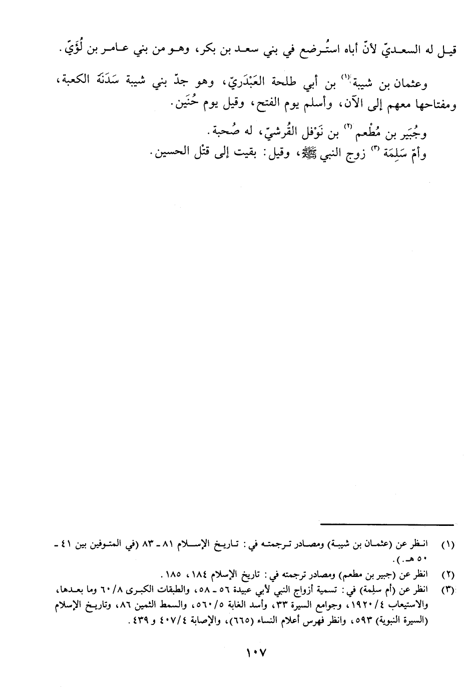 وَعُثْمَانُ بْنُ شَيْبَةَ بْنِ أَبِي طَلْحَةَ الْعَبْدَرِيُّ، وَهُوَ جَدُّ بَنِي شَيْبَةَ سَدَنَةِ الْكَعْبَةِ، وَمِفْتَاحُهَا مَعَهُمْ إِلَى الْآنَ، وَأَسْلَمَ يَوْمَ الْفَتْحِ، وَقِيلَ يَوْمَ حُنَيْنٍ، وَجَبَيْرُ بْنُ مَطْعِمِ بْنِ نَوْفَلٍ الْقُرَشِيُّ، لَهُ صُحْبَةٌ.