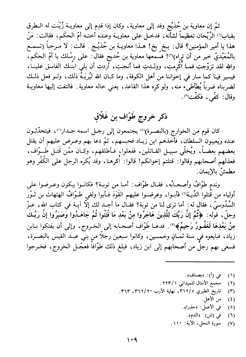 كَانَ قَوْمٌ مِنَ الْخَوَارِجِ بِالْبَصْرَةِ يَجْتَمِعُونَ إِلَى رَجُلٍ اسْمُهُ جِدَارٌ فَيَتَحَدَّثُونَ عِنْدَهُ وَيَعِيبُونَ السُّلْطَانَ، فَأَخَذَهُمُ ابْنُ زِيَادٍ فَحَبَسَهُمْ ثُمَّ دَعَا بِهِمْ وَعَرَضَ عَلَيْهِمْ أَنْ يَقْتُلَ بَعْضُهُمْ بَعْضًا وَيُخَلِّيَ سَبِيلَ الْقَاتِلِينَ، فَفَعَلُوا، فَأَطْلَقَهُمْ، وَكَانَ مِمَّنْ قَتَلَ طَوَّافٌ، فَعَذَلَهُمْ أَصْحَابُهُمْ وَقَالُوا: قَتَلْتُمْ إِخْوَانَكُمْ! قَالُوا: أُكْرِهْنَا وَقَدْ يُكْرَهُ الرَّجُلُ عَلَى الْكُفْرِ وَهُوَ مُطَمْئِنٌ بِالْإِيمَانِ.