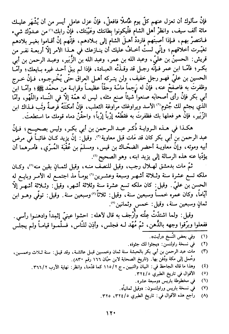 فَإِنْ سَأَلُوكَ أَنْ تَعْزِلَ عَنْهُمْ كُلَّ يَوْمٍ عَامِلًا فَافْعَلْ، فَإِنَّ عَزْلَ عَامِلٍ أَيْسَرُ مِنْ أَنْ يُشْهَرَ عَلَيْكَ مِائَةُ أَلْفِ سَيْفٍ، وَانْظُرْ أَهْلَ الشَّامِ فَلْيَكُونُوا بِطَانَتَكَ وَعَيْبَتَكَ، فَإِنْ رَابَكَ مَنْ عَدُّوِكَ شَيْءٌ فَانْتَصِرْ بِهِمْ، فَإِذَا أَصَبْتَهُمْ فَارْدُدْ أَهْلَ الشَّامِ إِلَى بِلَادِهِمْ، فَإِنَّهُمْ إِنْ أَقَامُوا بِغَيْرِ بِلَادِهِمْ تَغَيَّرَتْ أَخْلَاقُهُمْ، وَإِنِّي لَسْتُ أَخَافُ عَلَيْكَ أَنْ يُنَازِعَكَ فِي هَذَا الْأَمْرِ إِلَّا أَرْبَعَةُ نَفَرٍ مِنْ قُرَيْشٍ: الْحُسَيْنُ بْنُ عَلِيٍّ، وَعَبْدُ اللَّهِ بْنُ عُمَرَ، وَعَبْدُ اللَّهِ بْنُ الزُّبَيْرِ، وَعَبْدُ الرَّحْمَنِ بْنُ أَبِي بَكْرٍ، فَأَمَّا ابْنُ عُمَرَ فَإِنَّهُ رَجُلٌ قَدْ وَقَذَتْهُ الْعِبَادَةُ، فَإِذَا لَمْ يَبْقَ أَحَدٌ غَيْرُهُ بَايَعَكَ، وَأَمَّا الْحُسَيْنُ بْنُ عَلِيٍّ فَهُوَ رَجُلٌ خَفِيفٌ وَلَنْ يَتْرُكَهُ أَهْلُ الْعِرَاقِ حَتَّى يُخْرِجُوهُ، فَإِنْ خَرَجَ وَظَفِرْتَ بِهِ فَاصْفَحْ عَنْهُ، فَإِنَّ لَهُ رَحِمًا مَاسَّةً وَحَقًّا عَظِيمًا وَقَرَابَةً مِنْ مُحَمَّدٍ - صَلَّى اللَّهُ عَلَيْهِ وَسَلَّمَ - وَأَمَّا ابْنُ أَبِي بَكْرٍ فَإِنْ رَأَى أَصْحَابَهُ صَنَعُوا شَيْئًا صَنَعَ مِثْلَهُ، لَيْسَ لَهُ هِمَّةٌ إِلَّا فِي النِّسَاءِ وَاللَّهْوِ، وَأَمَّا الَّذِي يَجْثِمُ لَكَ جُثُومَ الْأَسَدِ وَيُرَاوِغُكَ مُرَاوَغَةَ الثَّعْلَبِ فَإِنْ أَمْكَنَتْهُ فُرْصَةٌ وَثَبَ فَذَاكَ ابْنُ الزُّبَيْرِ، فَإِنْ هُوَ فَعَلَهَا بِكَ فَظَفِرْتَ بِهِ فَقَطِّعْهُ إِرَبًا إِرَبًا، وَاحْقِنْ دِمَاءَ قَوْمِكَ مَا اسْتَطَعْتَ.