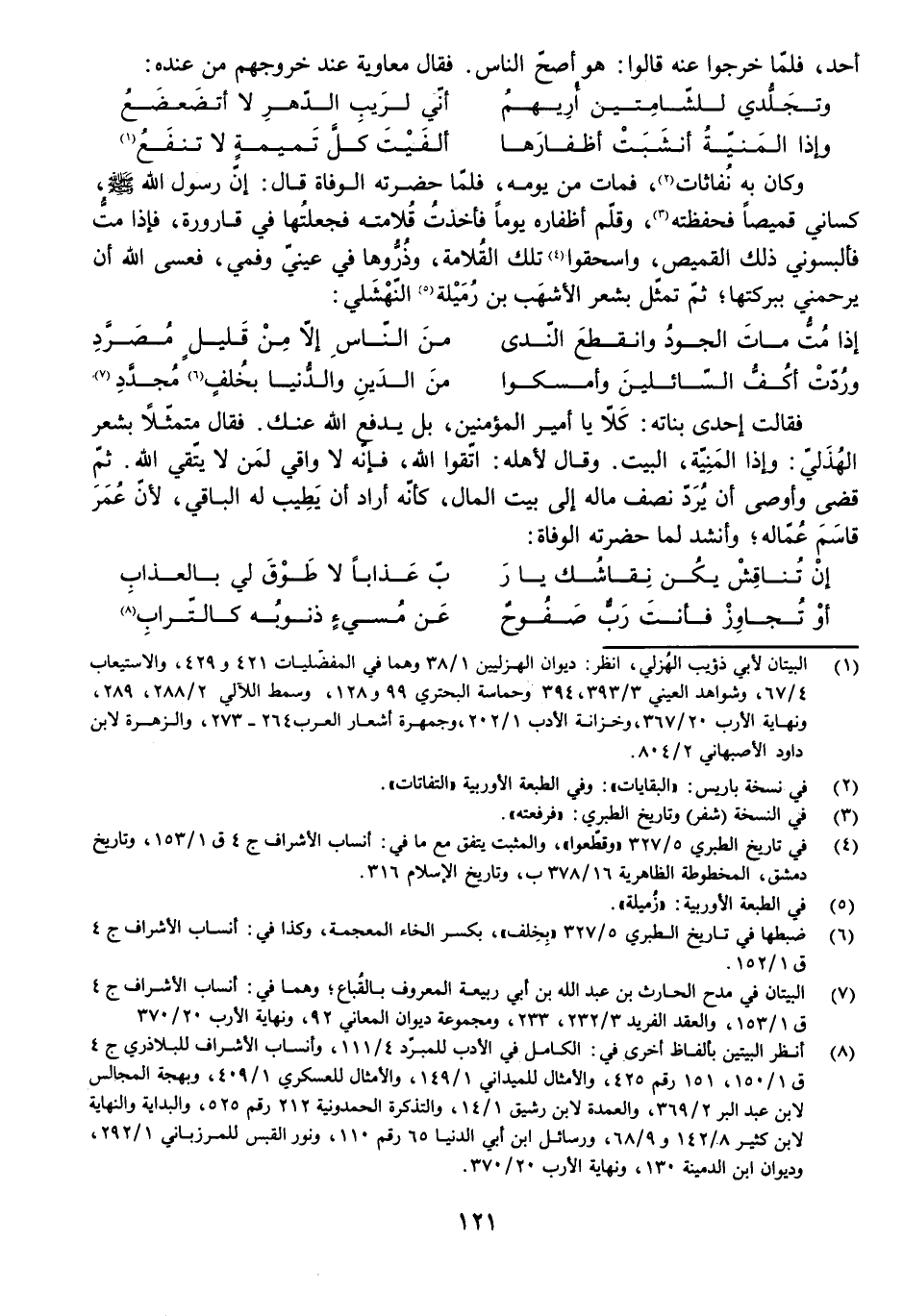 فَقَالَ مُتَمَثِّلًا بِشِعْرِ الْهُذَلِيِّ: وَإِذَا الْمَنِيَّةُ، الْبَيْتَ.