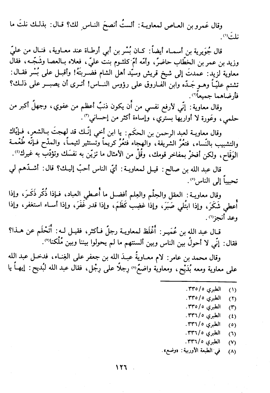وَقَالَ مُعَاوِيَةُ: إِنِّي لَأَرْفَعُ نَفْسِي مِنْ أَنْ يَكُونَ ذَنْبٌ أَعْظَمَ مِنْ عَفْوِي، وَجَهْلٌ أَكْبَرَ مِنْ حِلْمِي، وَعَوْرَةٌ لَا أُوَارِيهَا بِسَتْرِي، وَإِسَاءَةٌ أَكْثَرَ مِنْ إِحْسَانِي.