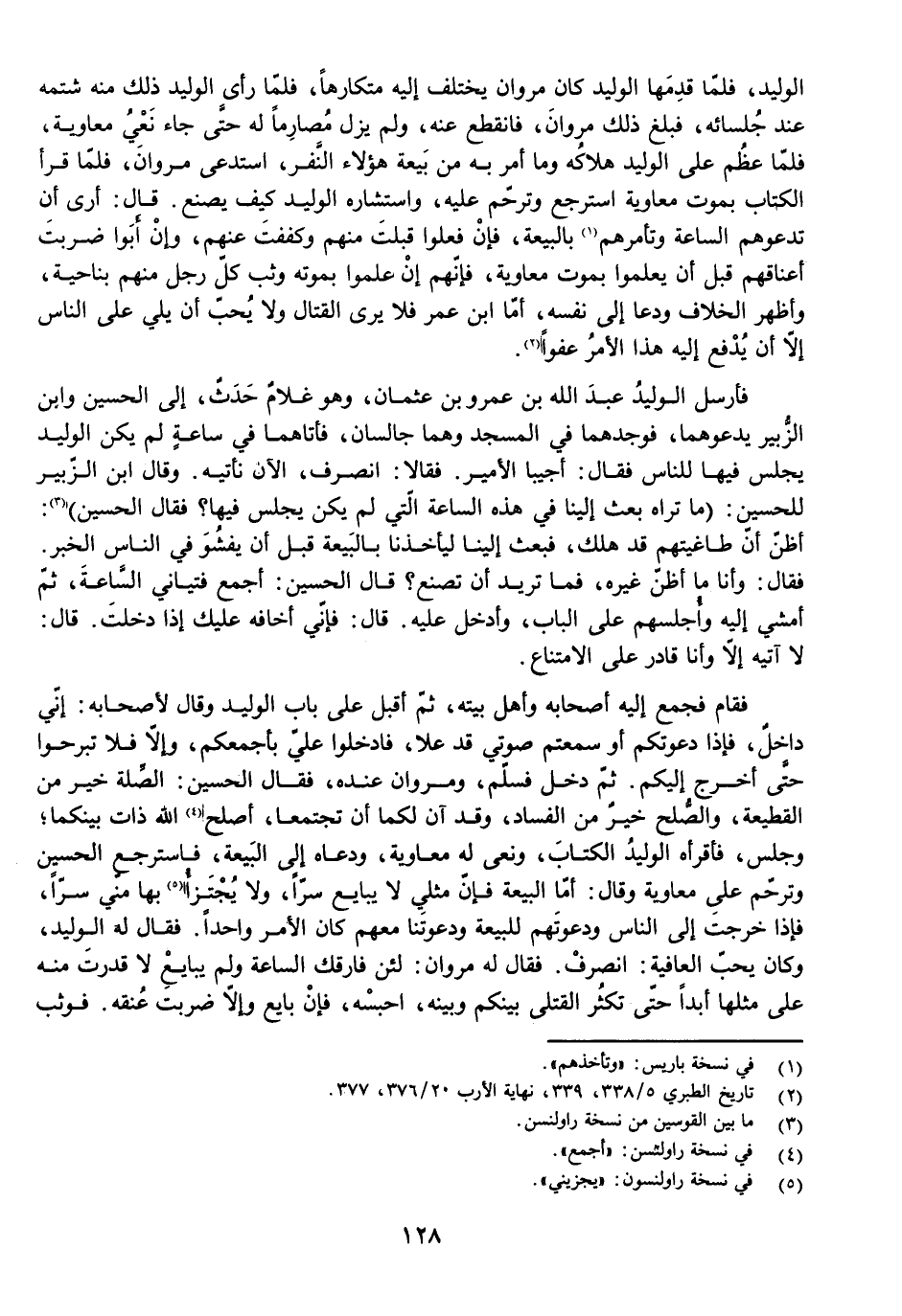 الصِّلَةُ خَيْرٌ مِنَ الْقَطِيعَةِ، وَالصُّلْحُ خَيْرٌ مِنَ الْفَسَادِ، وَقَدْ آنَ لَكُمَا أَنْ تَجْتَمِعَا، أَصْلَحَ اللَّهُ ذَاتَ بَيْنِكُمَا، وَجَلَسَ، فَأَقْرَأَهُ الْوَلِيدُ الْكِتَابَ، وَنَعَى لَهُ مُعَاوِيَةَ وَدَعَاهُ إِلَى الْبَيْعَةِ، فَاسْتَرْجَعَ الْحُسَيْنُ وَتَرَحَّمَ عَلَى مُعَاوِيَةَ وَقَالَ: أَمَّا الْبَيْعَةُ فَإِنَّ مِثْلِي لَا يُبَايِعُ سِرًّا وَلَا يُجْتَزَأُ بِهَا مِنِّي سِرًّا، فَإِذَا خَرَجْتَ إِلَى النَّاسِ وَدَعَوْتَهُمْ لِلْبَيْعَةِ وَدَعَوْتَنَا مَعَهُمْ كَانَ الْأَمْرُ وَاحِدًا.