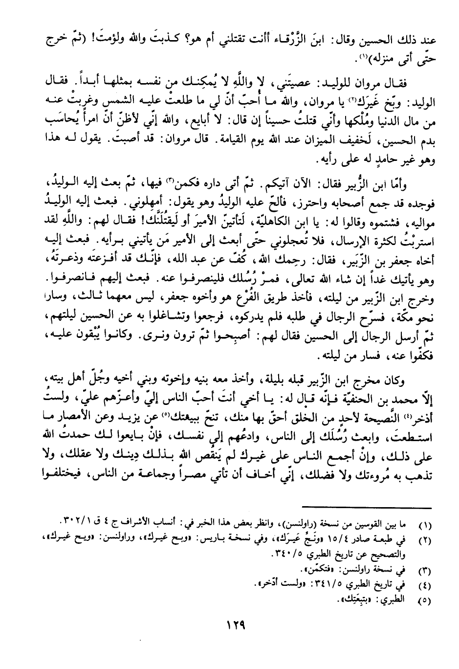 فَقَالَ مَرْوَانُ لِلْوَلِيدِ: عَصَيْتَنِي، لَا وَاللَّهِ لَا يُمَكِّنُكَ مِنْ نَفْسِهِ بِمِثْلِهَا أَبَدًا، فَقَالَ الْوَلِيدُ: وَبِّخْ غَيْرَكَ يَا مَرْوَانُ، وَاللَّهِ مَا أُحِبُّ أَنَّ لِي مَا طَلَعَتْ عَلَيْهِ الشَّمْسُ وَغَرَبَتْ عَنْهُ مِنْ مَالِ الدُّنْيَا وَمُلْكِهَا وَأَنِّي قَتَلْتُ حُسَيْنًا إِنْ قَالَ لَا أُبَايِعُ، وَاللَّهِ إِنِّي لَأَظُنَّ أَنَّ امْرَأً يُحَاسَبُ بِدَمِ الْحُسَيْنِ لَخَفِيفُ الْمِيزَانِ عِنْدَ اللَّهِ يَوْمَ الْقِيَامَةِ.