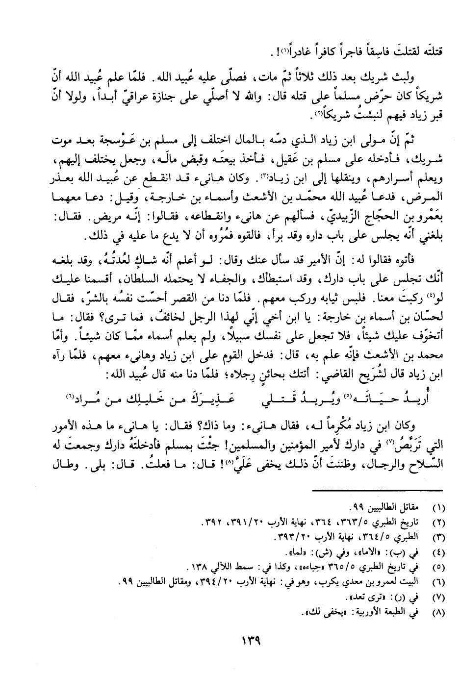 وَكَانَ ابْنُ زِيَادٍ مُكْرِمًا لَهُ، فَقَالَ هَانِئٌ: وَمَا ذَاكَ؟ فَقَالَ: يَا هَانِئُ مَا هَذِهِ الْأُمُورُ الَّتِي تَرَبَّصُ فِي دَارِكَ لِأَمِيرِ الْمُؤْمِنِينَ وَالْمُسْلِمِينَ! جِئْتَ بِمُسْلِمٍ فَأَدْخَلْتَهُ دَارَكَ وَجَمَعْتَ لَهُ السِّلَاحَ وَالرِّجَالَ وَظَنَنْتَ أَنَّ ذَلِكَ يَخْفَى عَلَيَّ! قَالَ: مَا فَعَلْتُ.