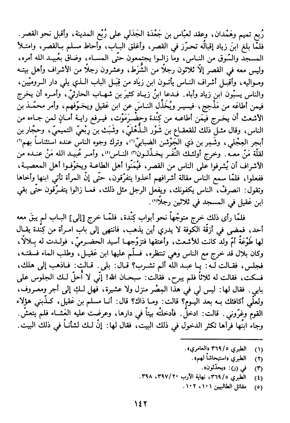 وَأَغْلَقَ الْبَابَ، وَأَحَاطَ مُسْلِمٌ بِالْقَصْرِ وَامْتَلَأَ الْمَسْجِدُ وَالسُّوقُ مِنَ النَّاسِ وَمَا زَالُوا يَجْتَمِعُونَ حَتَّى الْمَسَاءَ، وَضَاقَ بِعُبَيْدِ اللَّهِ أَمْرُهُ وَلَيْسَ مَعَهُ فِي الْقَصْرِ إِلَّا ثَلَاثُونَ رَجُلًا مِنَ الشُّرَطِ وَعِشْرُونَ رَجُلًا مِنَ الْأَشْرَافِ وَأَهْلُ بَيْتِهِ وَمَوَالِيهِ، وَأَقْبَلَ أَشْرَافُ النَّاسِ يَأْتُونَ ابْنَ زِيَادٍ مِنْ قِبَلِ الْبَابِ الَّذِي يَلِي دَارَ الرُّومِيِّينَ وَالنَّاسُ يَسُبُّونَ ابْنَ زِيَادٍ وَأَبَاهُ.