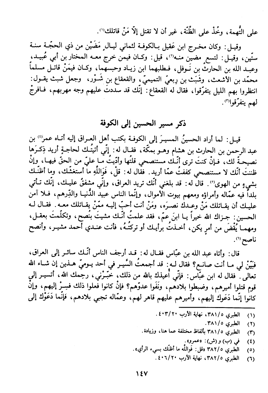 فَقَالَ لَهُ ابْنُ عَبَّاسٍ: فَإِنِّي أُعِيذُكَ بِاللَّهِ مِنْ ذَلِكَ، خَبِّرْنِي، رَحِمَكَ اللَّهُ، أَتَسِيرُ إِلَى قَوْمٍ قَتَلُوا أَمِيرَهُمْ وَضَبَطُوا بِلَادَهُمْ وَنَفَوْا عَدُوَّهُمْ؟ فَإِنْ كَانُوا فَعَلُوا ذَلِكَ فَسِرْ إِلَيْهِمْ، وَإِنْ كَانُوا إِنَّمَا دَعَوْكَ إِلَيْهِمْ وَأَمِيرُهُمْ عَلَيْهِمْ قَاهِرٌ لَهُمْ وَعُمَّالُهُ تَجْبِي بِلَادَهُمْ فَإِنَّمَا دَعَوْكَ إِلَى