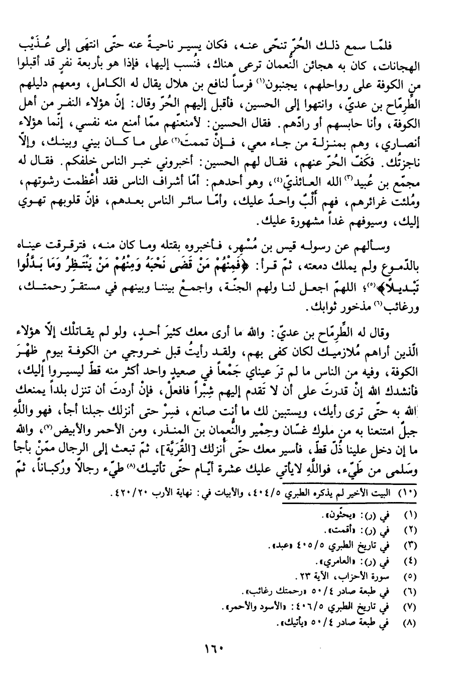 فَلَمَّا سَمَّعَ ذَلِكَ الْحُرُّ تَنَحَّى عَنْهُ فَكَانَ يَسِيرُ نَاحِيَةً عَنْهُ حَتَّى انْتَهَى إِلَى عُذَيْبِ الْهِجَانَاتِ، كَانَ بِهِ هَجَائِنُ النُّعْمَانِ تُرْعَى هُنَاكَ فَنُسِبَ إِلَيْهَا، فَإِذَا هُوَ بِأَرْبَعَةِ نَفَرٍ قَدْ أَقْبَلُوا مِنَ الْكُوفَةِ عَلَى رَوَاحِلِهِمْ يُجَنِّبُونَ فَرَسًا لِنَافِعِ بْنِ هِلَالٍ يُقَالُ لَهُ الْكَامِلُ وَمَعَهُمْ دَلِيلُهُمُ الطِّرِمَّاحُ بْنُ عَدِيٍّ وَانْتَهَوْا إِلَى الْحُسَيْنِ، فَأَقْبَلَ إِلَيْهِمُ الْحُرُّ وَقَالَ: إِنَّ هَؤُلَاءِ النَّفَرَ مِنْ أَهْلِ الْكُوفَةِ وَأَنَا حَابِسُهُمْ أَوْ رَادُّهُمْ.