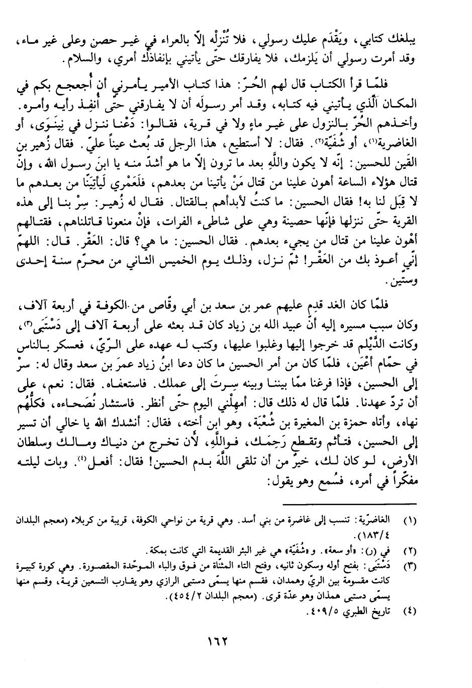 فَلَمَّا قَرَأَ الْكِتَابَ قَالَ لَهُمُ الْحُرُّ: هَذَا كِتَابُ الْأَمِيرِ يَأْمُرُنِي أَنْ أُجَعْجِعَ بِكُمْ فِي الْمَكَانِ الَّذِي يَأْتِينِي فِيهِ كِتَابُهُ، وَقَدْ أَمَرَ رَسُولَهُ أَنْ لَا يُفَارِقَنِي حَتَّى أُنْفِذَ رَأْيَهُ وَأَمْرَهُ.