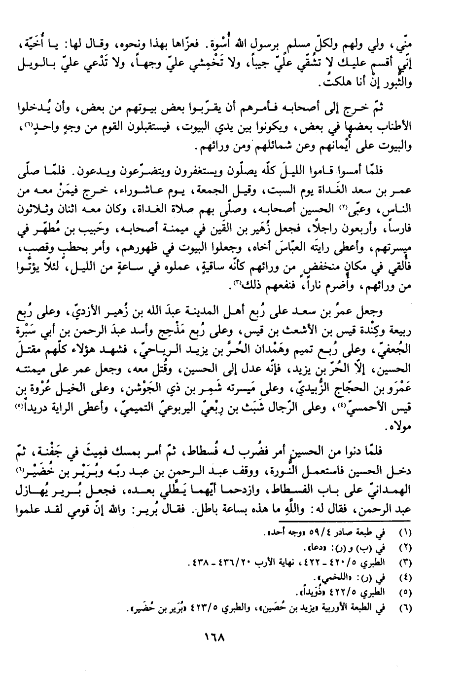 فَلَمَّا دَنَوْا مِنَ الْحُسَيْنِ أَمَرَ فَضُرِبَ لَهُ فُسْطَاطٌ، ثُمَّ أَمَرَ بِمِسْكٍ فَمِيثَ فِي جَفْنَةٍ، ثُمَّ دَخَلَ الْحُسَيْنُ فَاسْتَعْمَلَ النُّورَةَ، وَوَقَفَ عَبْدُ الرَّحْمَنِ بْنُ عَبْدِ رَبِّهِ وَبُرَيْرُ بْنُ خُضَيْرٍ الْهَمْدَانِيُّ عَلَى بَابِ الْفُسْطَاطِ وَازْدَحَمَا أَيُّهُمَا يَطْلِي بَعْدَهُ، فَجَعَلَ بُرَيْرٌ يُهَازِلُ عَبْدَ الرَّحْمَنِ، فَقَالَ لَهُ: وَاللَّهِ مَا هَذِهِ بِسَاعَةِ بَاطِلٍ.