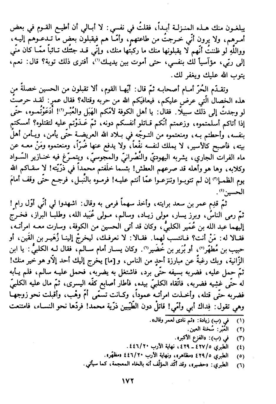 وَتَقَدَّمَ الْحُرُّ أَمَامَ أَصْحَابِهِ ثُمَّ قَالَ: أَيُّهَا الْقَوْمُ أَلَا تَقْبَلُونَ مِنَ الْحُسَيْنِ خَصْلَةً مِنْ هَذِهِ الْخِصَالِ الَّتِي عَرَضَ عَلَيْكُمْ فَيُعَافِيَكُمُ اللَّهُ مِنْ حَرْبِهِ وَقِتَالِهِ؟ فَقَالَ عُمَرُ: لَقَدْ حَرَصْتُ لَوْ وَجَدْتُ إِلَى ذَلِكَ سَبِيلًا فَقَالَ: يَا أَهْلَ الْكُوفَةِ لِأُمِّكُمُ الْهَبَلُ وَالْعُبْرُ! أَدَعَوْتُمُوهُ حَتَّى إِذَا أَتَاكُمْ أَسْلَمْتُمُوهُ وَزَعَمْتُمْ أَنَّكُمْ قَاتِلُوا أَنْفُسَكُمْ دُونَهُ ثُمَّ عَدَوْتُمْ لِتَقْتُلُوهُ؟ أَمْسَكْتُمْ بِنَفْسِهِ وَأَحَطْتُمْ بِهِ وَمَنَعْتُمُوهُ مِنَ التَّوَجُّهِ فِي بِلَادِ اللَّهِ الْعَرِيضَةِ حَتَّى يَأْمَنَ وَيَأْمَنَ أَهْلُ بَيْتِهِ، فَأَصْبَحَ كَالْأَسِيرِ لَا يَمْلِكُ لِنَفْسِهِ نَفْعًا وَلَا يَدْفَعُ عَنْهَا ضُرًّا، وَمَنَعْتُمُوهُ وَمَنْ مَعَهُ عَنْ مَاءِ الْفُرَاتِ الْجَارِي يَشْرَبُهُ الْيَهُودِيُّ وَالنَّصْرَانِيُّ وَالْمَجُوسِيُّ وَيَتَمَرَّغُ فِيهِ خَنَازِيرُ السَّوَادِ وَكِلَابُهُ وَهَا هُوَ وَأَهْلُهُ قَدْ صَرَعَهُمُ الْعَطَشُ! بِئْسَمَا خَلَفْتُمْ مُحَمَّدًا فِي ذُرِّيَّتِهِ! لَا سَقَاكُمُ اللَّهُ يَوْمَ الظَّمَأِ إِنْ لَمْ تَتُوبُوا وَتَنْزِعُوا عَمَّا أَنْتُمْ عَلَيْهِ! فَرَمَوْهُ بِالنَّبْلِ، فَرَجَعَ حَتَّى وَقَفَ أَمَامَ الْحُسَيْنِ.