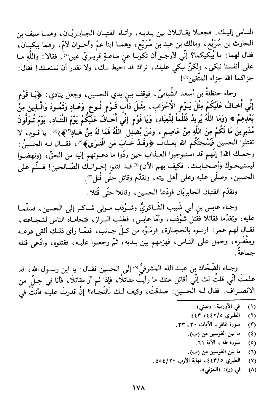 وَجَاءَ حَنْظَلَةُ بْنُ أَسْعَدَ الشِّبَامِيُّ فَوَقَفَ بَيْنَ يَدَيِ الْحُسَيْنِ وَجَعَلَ يُنَادِي: {يَاقَوْمِ إِنِّي أَخَافُ عَلَيْكُمْ مِثْلَ يَوْمِ الْأَحْزَابِ - مِثْلَ دَأْبِ قَوْمِ نُوحٍ وَعَادٍ وَثَمُودَ وَالَّذِينَ مِنْ بَعْدِهِمْ وَمَا اللَّهُ يُرِيدُ ظُلْمًا لِلْعِبَادِ - وَيَا قَوْمِ إِنِّي أَخَافُ عَلَيْكُمْ يَوْمَ التَّنَادِ - يَوْمَ تُوَلُّونَ مُدْبِرِينَ مَا لَكُمْ مِنَ اللَّهِ مِنْ عَاصِمٍ وَمَنْ يُضْلِلِ اللَّهُ فَمَا لَهُ مِنْ هَادٍ} [غافر: 30 - 33] . يَا قَوْمِ لَا تَقْتُلُوا الْحُسَيْنَ فَيُسْحِتَكُمُ اللَّهُ بِعَذَابٍ {وَقَدْ خَابَ مَنِ افْتَرَى} [طه: 61] ، فَقَالَ لَهُ الْحُسَيْنُ: رَحِمَكَ اللَّهُ! إِنَّهُمْ قَدِ اسْتَوْجَبُوا الْعَذَابَ حِينَ رَدُّوا مَا دَعَوْتَهُمْ إِلَيْهِ مِنَ الْحَقِّ وَنَهَضُوا لِيَسْتَبِيحُوكَ وَأَصْحَابَكَ فَكَيْفَ بِهِمُ الْآنَ قَدْ قَتَلُوا إِخْوَانَكَ الصَّالِحِينَ! فَسَلَّمَ عَلَى الْحُسَيْنِ وَصَلَّى عَلَيْهِ وَعَلَى أَهْلِ بَيْتِهِ وَتَقَدَّمَ وَقَاتَلَ حَتَّى قُتِلَ.
