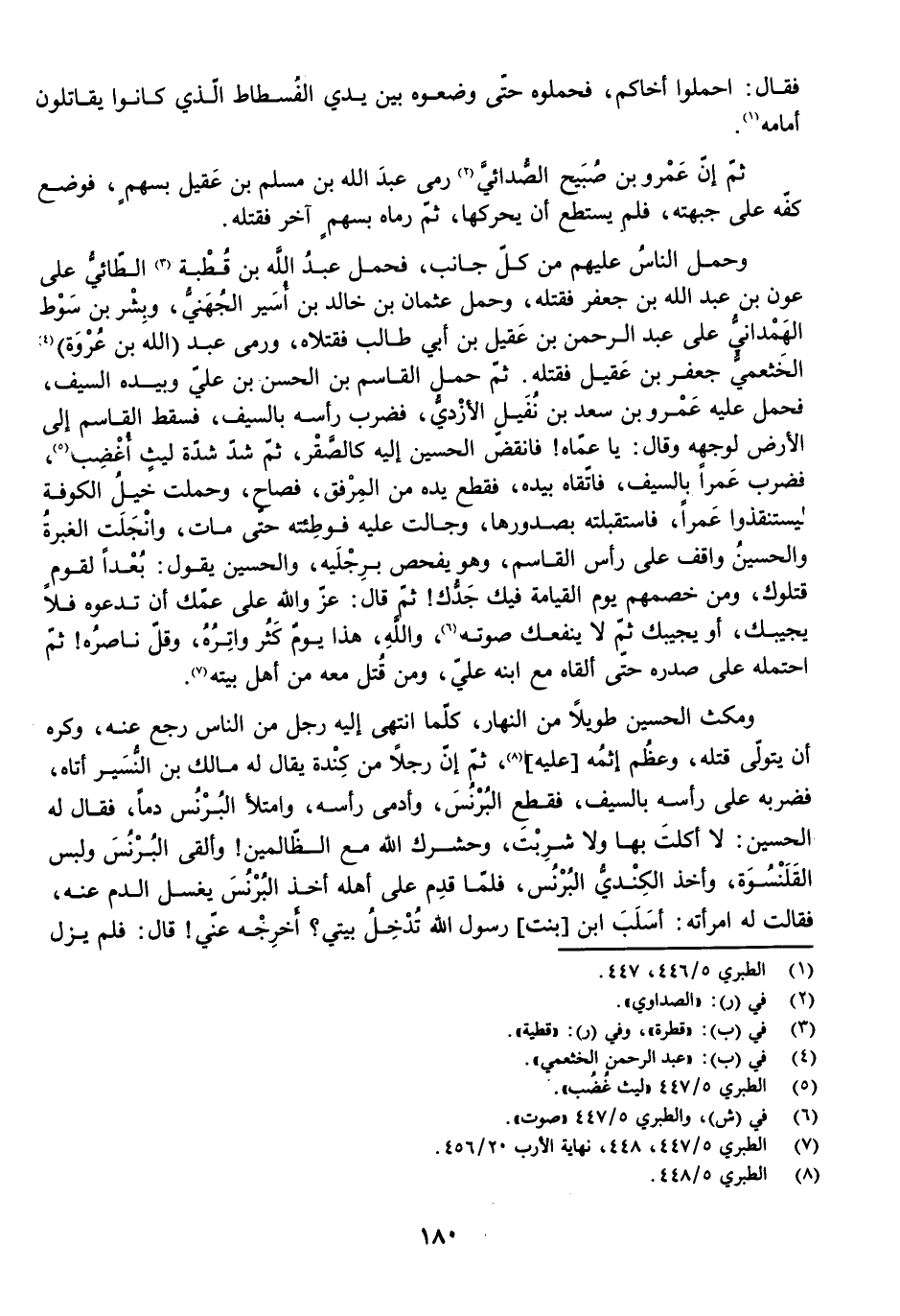 وَمَكَثَ الْحُسَيْنُ طَوِيلًا مِنَ النَّهَارِ كُلَّمَا انْتَهَى إِلَيْهِ رَجُلٌ مِنَ النَّاسِ رَجَعَ عَنْهُ وَكَرِهَ أَنْ يَتَوَلَّى قَتْلَهُ وَعَظُمَ إِثْمُهُ [عَلَيْهِ] ثُمَّ إِنَّ رَجُلًا مِنْ كِنْدَةَ يُقَالُ لَهُ مَالِكُ بْنُ النُّسَيْرِ أَتَاهُ فَضَرَبَهُ عَلَى رَأْسِهِ بِالسَّيْفِ فَقَطَعَ الْبُرْنُسَ، وَأَدْمَى رَأْسَهُ وَامْتَلَأَ الْبُرْنُسُ دَمًا، فَقَالَ لَهُ الْحُسَيْنُ: لَا أَكَلْتَ بِهَا وَلَا شَرِبْتَ وَحَشَرَكَ اللَّهُ مَعَ الظَّالِمِينَ! وَأَلْقَى الْبُرْنُسَ وَلَبِسَ الْقَلَنْسُوَةَ، وَأَخَذَ الْكِنْدِيُّ الْبُرْنُسَ، فَلَمَّا قَدِمَ عَلَى أَهْلِهِ أَخَذَ الْبُرْنُسَ يَغْسِلُ الدَّمَ عَنْهُ، فَقَالَتْ لَهُ امْرَأَتُهُ: أَسَلَبَ ابْنِ [بِنْتِ] رَسُولِ اللَّهِ تُدْخِلُ بَيْتِي؟ أَخْرِجْهُ عَنِّي! قَالَ: فَلَمْ يَزَلْ