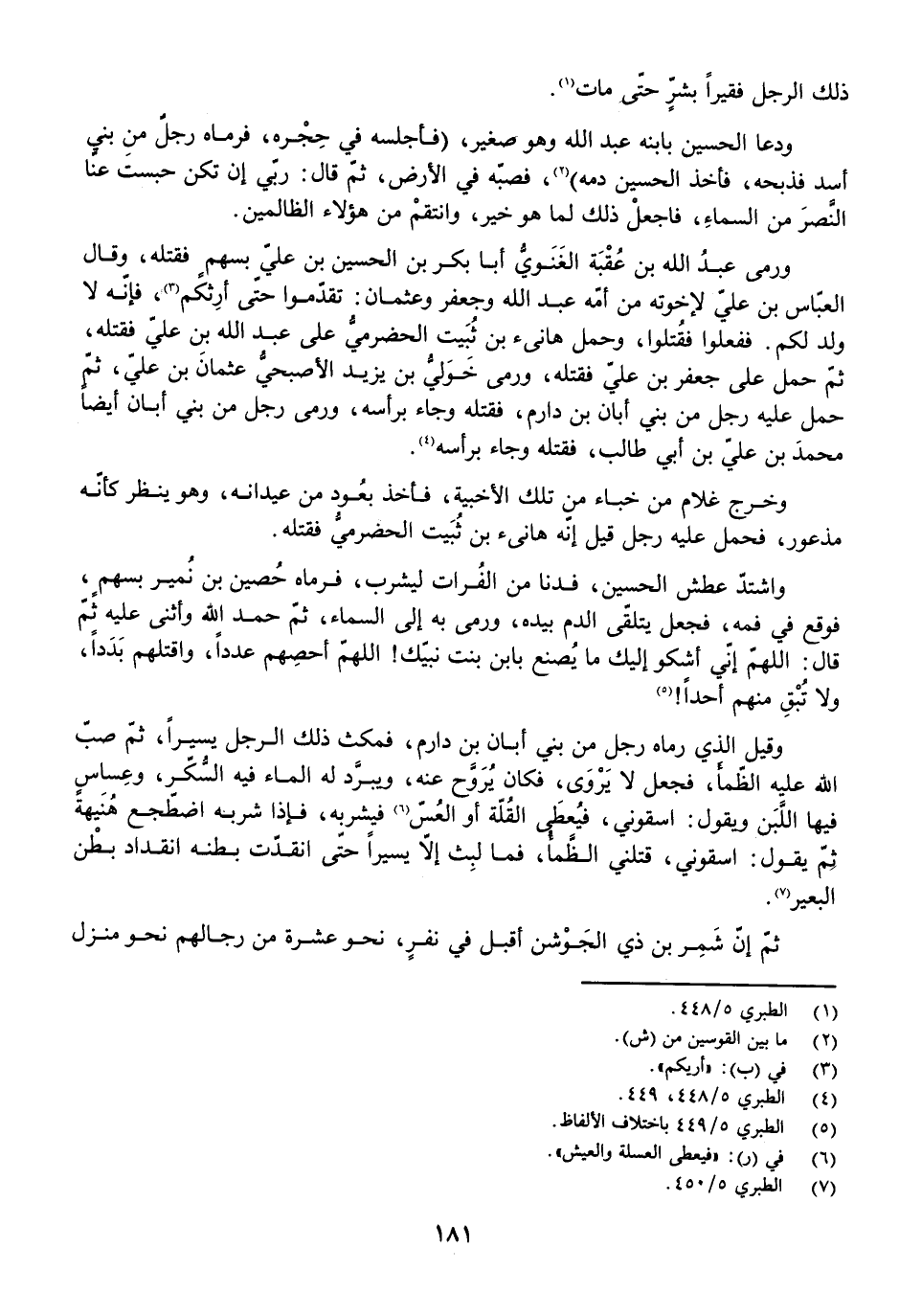 وَدَعَا الْحُسَيْنُ بِابْنِهِ عَبْدِ اللَّهِ وَهُوَ صَغِيرٌ (فَأَجْلَسَهُ فِي حِجْرِهِ، فَرَمَاهُ رَجُلٌ مِنْ بَنِي أَسَدٍ فَذَبَحَهُ، فَأَخَذَ الْحُسَيْنُ دَمَهُ) فَصَبَّهُ فِي الْأَرْضِ ثُمَّ قَالَ: رَبِّي إِنْ تَكُنْ حَبَسْتَ عَنَّا النَّصْرَ مِنَ السَّمَاءِ فَاجْعَلْ ذَلِكَ لِمَا هُوَ خَيْرٌ وَانْتَقِمْ مِنْ هَؤُلَاءِ الظَّالِمِينَ.