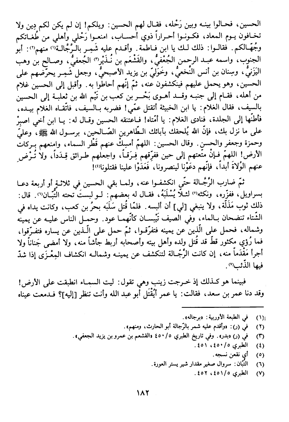 ثُمَّ ضَارَبَ الرَّجَّالَةَ حَتَّى انْكَشَفُوا عَنْهُ، وَلَمَّا بَقِيَ الْحُسَيْنُ فِي ثَلَاثَةٍ أَوْ أَرْبَعَةٍ دَعَا بِسَرَاوِيلَ فَفَزَّرَهُ وَنَكَثَهُ لِئَلَّا يُسْلَبَهُ، فَقَالَ لَهُ بَعْضُهُمْ: لَوْ لَبِسْتَ تَحْتَهُ التُّبَّانَ.