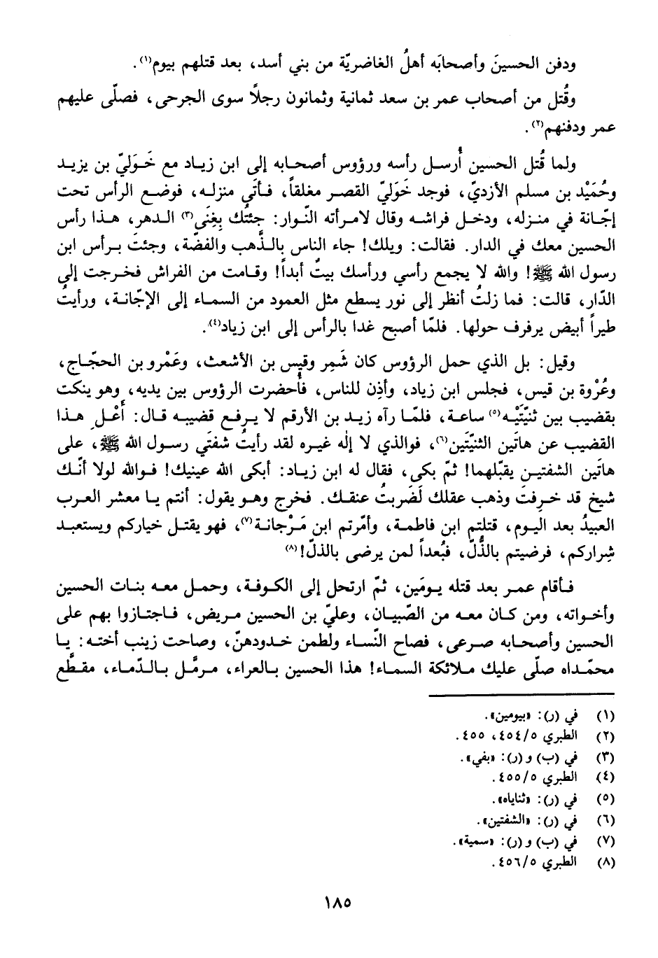 فَأَقَامَ عُمَرُ بَعْدَ قَتْلِهِ يَوْمَيْنِ ثُمَّ ارْتَحَلَ إِلَى الْكُوفَةِ وَحَمَلَ مَعَهُ بَنَاتِ الْحُسَيْنِ وَأَخَوَاتِهِ وَمَنْ كَانَ مَعَهُ مِنَ الصِّبْيَانِ، وَعَلِيُّ بْنُ الْحُسَيْنِ مَرِيضٌ، فَاجْتَازُوا بِهِمْ عَلَى الْحُسَيْنِ وَأَصْحَابِهِ صَرْعَى، فَصَاحَ النِّسَاءُ وَلَطَمْنَ خُدُودَهُنَّ، وَصَاحَتْ زَيْنَبُ أُخْتُهُ: يَا مُحَمَّدَاهُ صَلَّى عَلَيْكَ مَلَائِكَةُ السَّمَاءِ! هَذَا الْحُسَيْنُ بِالْعَرَاءِ، مُرَمَّلٌ بِالدِّمَاءِ، مُقَطَّعُ