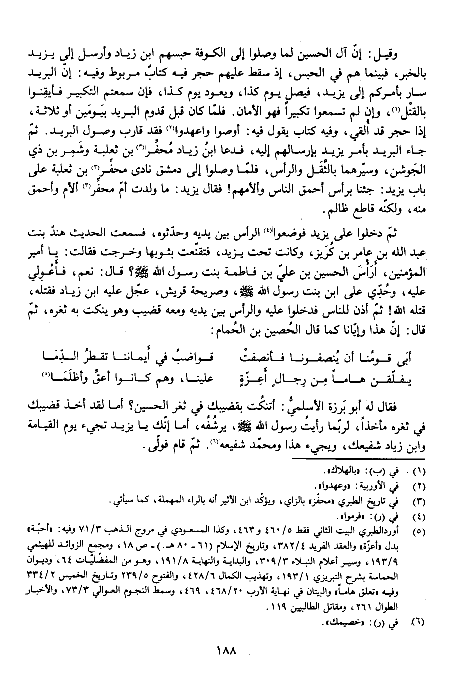 ثُمَّ دَخَلُوا عَلَى يَزِيدَ فَوَضَعُوا الرَّأْسَ بَيْنَ يَدَيْهِ وَحَدَّثُوهُ، فَسَمِعَتِ الْحَدِيثَ هِنْدَ بِنْتَ عَبْدِ اللَّهِ بْنِ كُرَيْزٍ، وَكَانَتْ تَحْتَ يَزِيدَ، فَتَقَنَّعَتْ بِثَوْبِهَا وَخَرَجَتْ فَقَالَتْ: يَا أَمِيرَ الْمُؤْمِنِينَ أَرْأَسُ الْحُسَيْنِ بْنِ عَلِيِّ ابْنُ فَاطِمَةَ بِنْتِ رَسُولِ اللَّهِ - صَلَّى اللَّهُ عَلَيْهِ وَسَلَّمَ -؟ قَالَ: نَعَمْ، فَأَعْوِلِي عَلَيْهِ، وَحُدِّي عَلَى ابْنِ بِنْتِ رَسُولِ اللَّهِ - صَلَّى اللَّهُ عَلَيْهِ وَسَلَّمَ - وَصَرِيحَةِ قُرَيْشٍ، عَجَّلَ عَلَيْهِ ابْنُ زِيَادٍ فَقَتَلَهُ، قَتَلَهُ اللَّهُ! ثُمَّ أَذِنَ لِلنَّاسِ فَدَخَلُوا عَلَيْهِ وَالرَّأْسُ بَيْنَ يَدَيْهِ وَمَعَهُ قَضِيبٌ وَهُوَ يَنْكُتُ بِهِ ثَغْرَهُ، ثُمَّ قَالَ: إِنَّ هَذَا وَإِيَّانَا كَمَا قَالَ الْحُصَيْنُ بْنُ الْحُمَامِ: