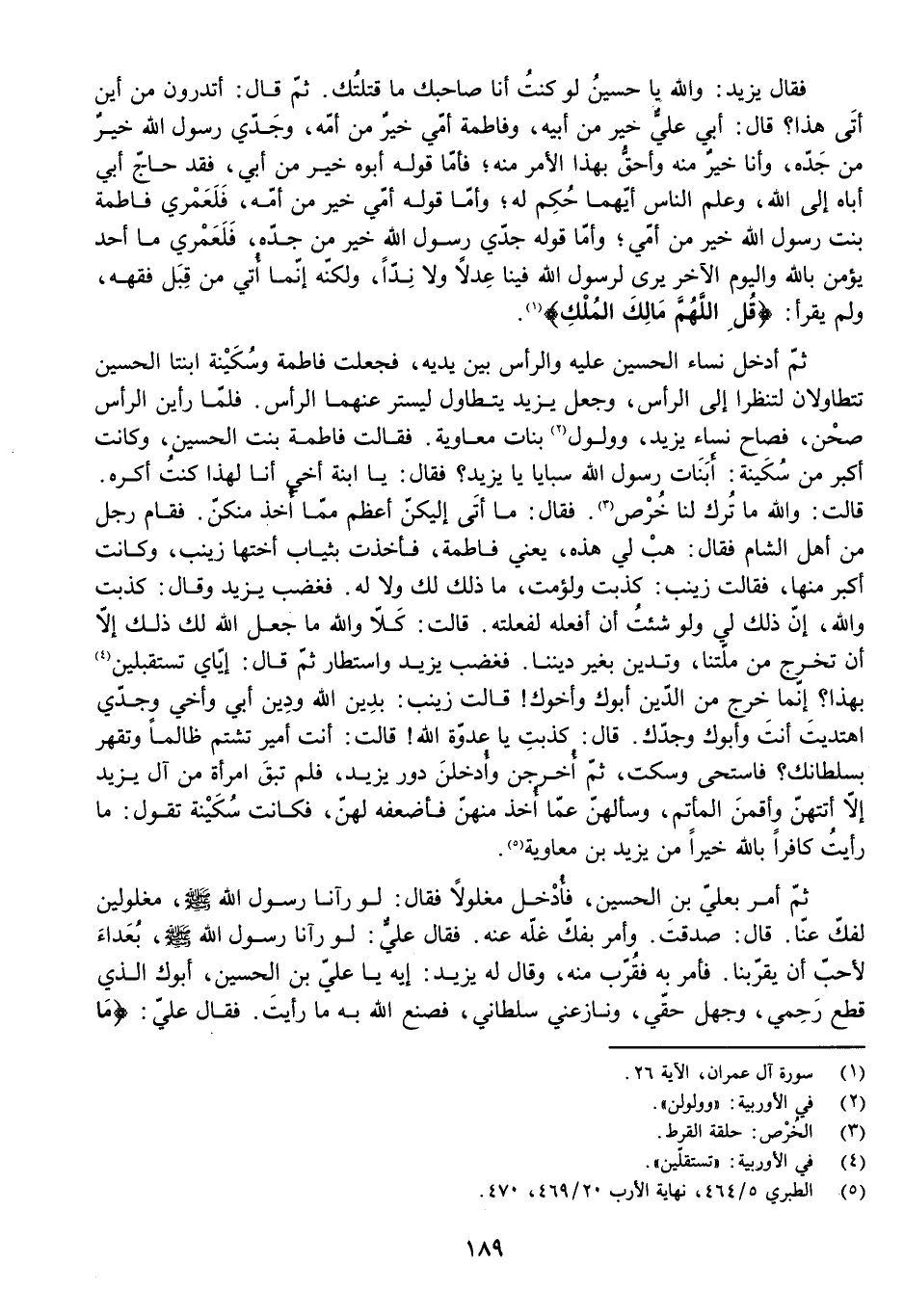 فَقَالَ يَزِيدُ: وَاللَّهِ يَا حُسَيْنُ لَوْ كُنْتُ أَنَا صَاحِبُكَ مَا قَتَلْتُكَ. ثُمَّ قَالَ: أَتَدْرُونَ مِنْ أَيْنَ أَتَى هَذَا؟ قَالَ: أَبِي عَلِيٌّ خَيْرٌ مِنْ أَبِيهِ، وَفَاطِمَةُ أُمِّي خَيْرٌ مِنْ أُمِّهِ، وَجَدِّي رَسُولُ اللَّهِ خَيْرٌ مِنْ جَدِّهِ، وَأَنَا خَيْرٌ مِنْهُ وَأَحَقُّ بِهَذَا الْأَمْرِ مِنْهُ، فَأَمَّا قَوْلُهُ أَبُوهُ خَيْرٌ مِنْ أَبِي فَقَدْ حَاجَّ أَبِي أَبَاهُ إِلَى اللَّهِ وَعَلِمَ النَّاسُ أَيَّهُمَا حُكِمَ لَهُ، وَأَمَّا قَوْلُهُ أُمِّي خَيْرٌ مِنْ أُمِّهِ فَلَعَمْرِي فَاطِمَةُ بِنْتُ رَسُولِ اللَّهِ خَيْرٌ مِنْ أُمِّي، وَأَمَّا قَوْلُهُ جَدِّي رَسُولُ اللَّهِ خَيْرٌ مِنْ جَدِّهِ فَلَعَمْرِي مَا أَحَدٌ يُؤْمِنُ بِاللَّهِ وَالْيَوْمِ الْآخِرِ يَرَى لِرَسُولِ اللَّهِ فِينَا عِدْلًا وَلَا نِدًّا، وَلَكِنَّهُ إِنَّمَا أُتِيَ مِنْ قِبَلِ فِقْهِهِ، وَلَمْ يَقْرَأْ: {قُلِ اللَّهُمَّ مَالِكَ الْمُلْكِ} [آل عمران: 26] .