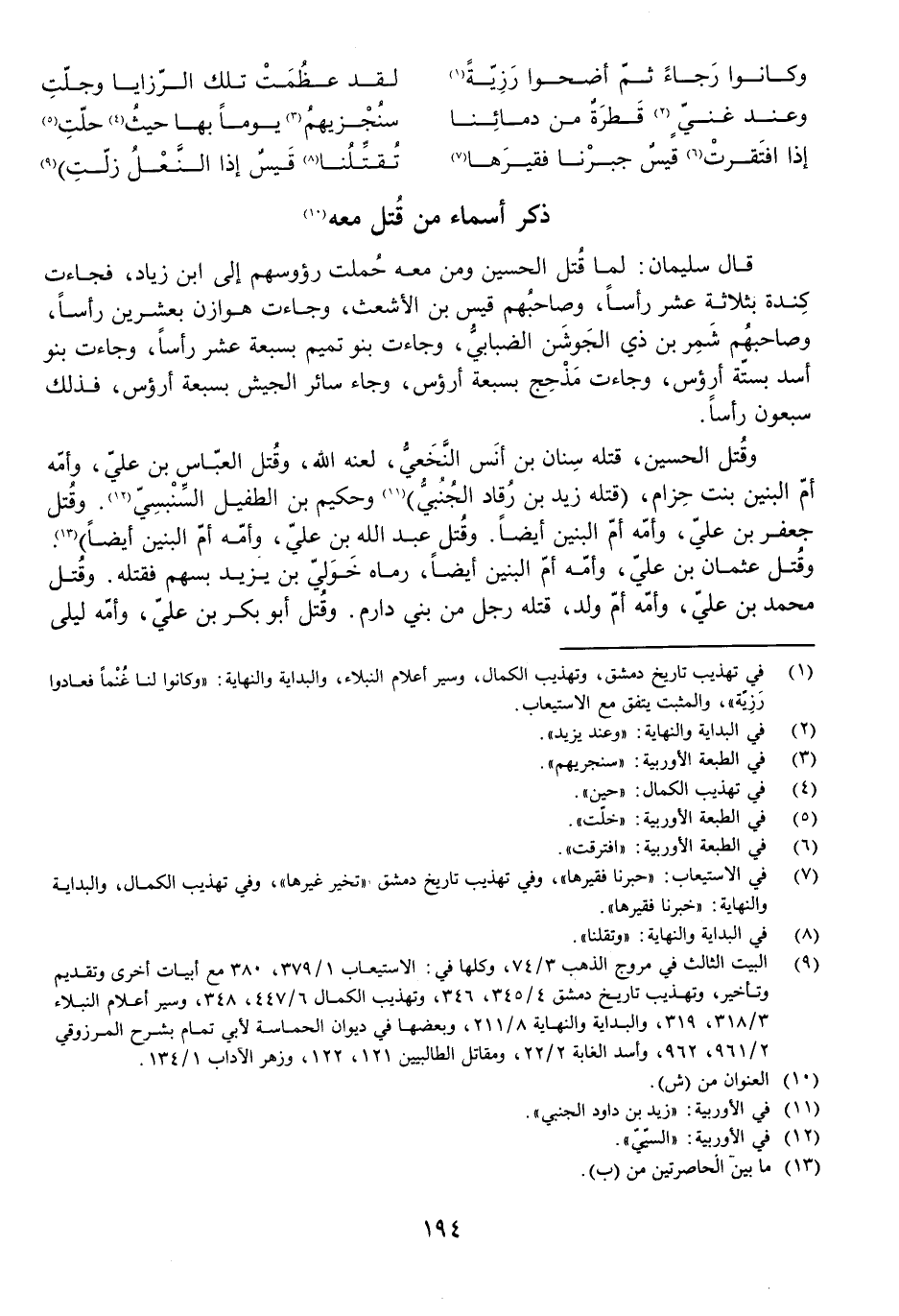 وَقُتِلَ الْحُسَيْنُ، قَتَلَهُ سِنَانُ بْنُ أَنَسٍ النَّخَعِيُّ، لَعَنَهُ اللَّهُ، وَقُتِلَ الْعَبَّاسُ بْنُ عَلِيٍّ، وَأُمُّهُ أُمُّ الْبَنِينَ بِنْتُ حِزَامٍ، قَتَلَهُ (زَيْدُ بْنُ رُقَادٍ الْجُنُبِيُّ) وَحَكِيمُ بْنُ الطُّفَيْلِ السِّنْبِسِيُّ.