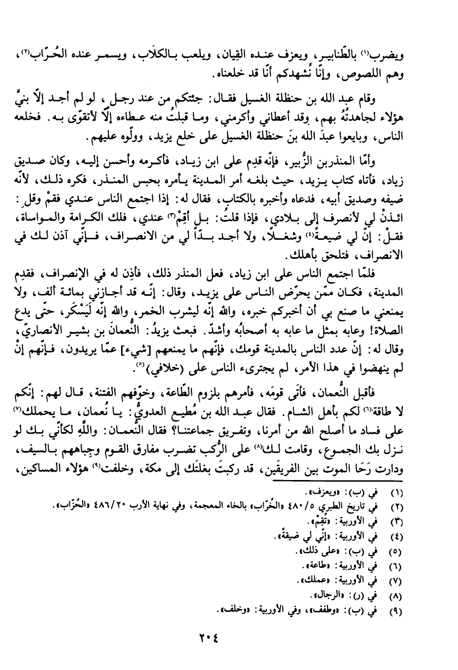 وَيَضْرِبُ بِالطَّنَابِيرِ وَيَعْزِفُ عِنْدَهُ الْقِيَانُ وَيَلْعَبُ بِالْكِلَابِ وَيَسْمُرُ عِنْدَهُ الْحُرَّابُ، وَهُمُ اللُّصُوصُ، وَإِنَّا نُشْهِدُكُمْ أَنَّا قَدْ خَلَعْنَاهُ.