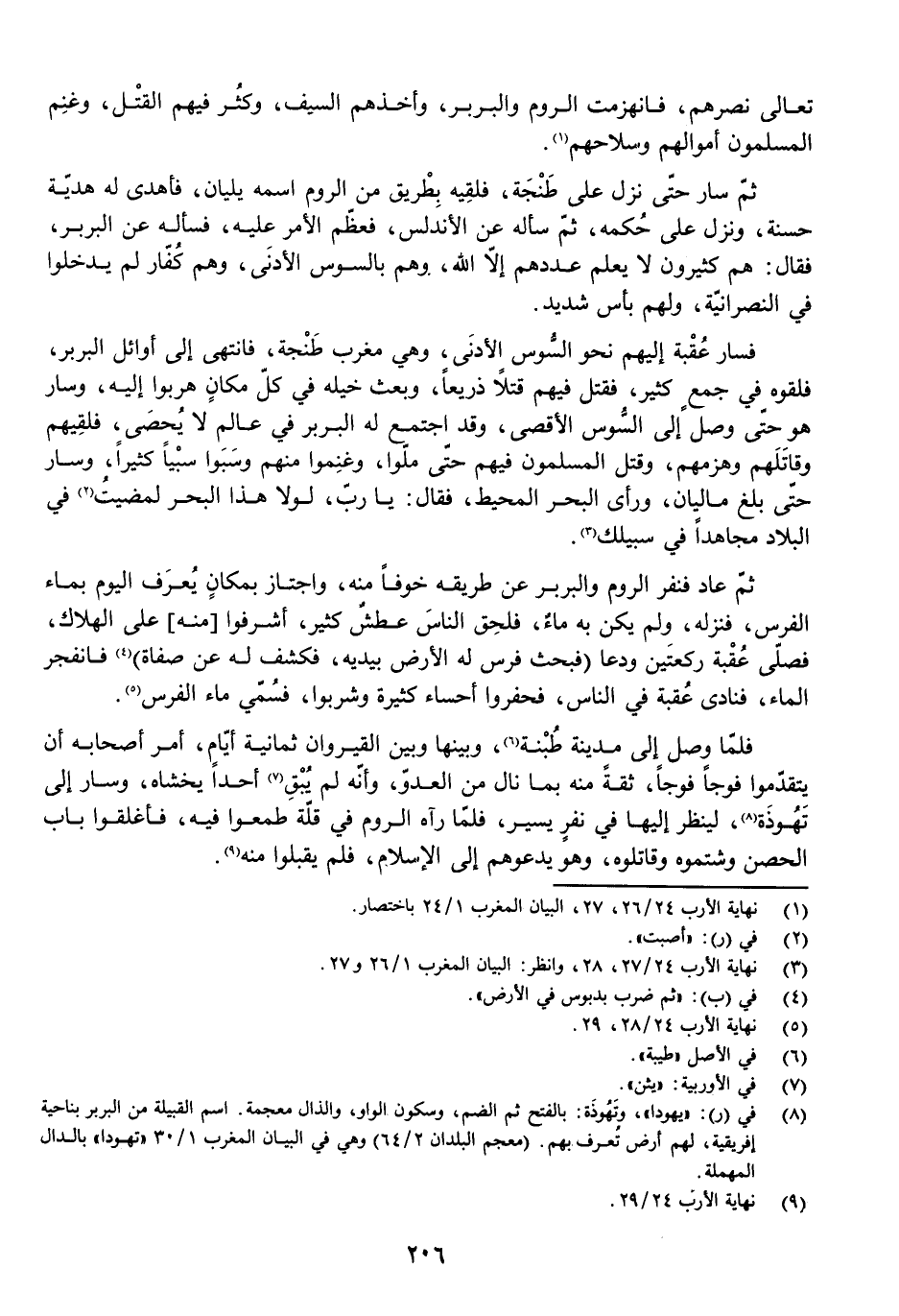 ثُمَّ سَارَ حَتَّى نَزَلَ عَلَى طَنْجَةَ فَلَقِيَهُ بِطْرِيقٌ مِنَ الرُّومِ اسْمُهُ يَلْيَانُ فَأَهْدَى لَهُ هَدِيَّةً حَسَنَةً وَنَزَلَ عَلَى حُكْمِهِ، ثُمَّ سَأَلَهُ عَنِ الْأَنْدَلُسِ فَعَظُمَ الْأَمْرُ عَلَيْهِ، فَسَأَلَهُ عَنِ الْبَرْبَرِ، فَقَالَ: هُمْ كَثِيرُونَ لَا يَعْلَمُ عَدَدَهُمْ إِلَّا اللَّهُ، وَهُمْ بِالسُّوسِ الْأَدْنَى، وَهُمْ كُفَّارٌ لَمْ يَدْخُلُوا فِي النَّصْرَانِيَّةِ وَلَهُمْ بَأْسٌ شَدِيدٌ.