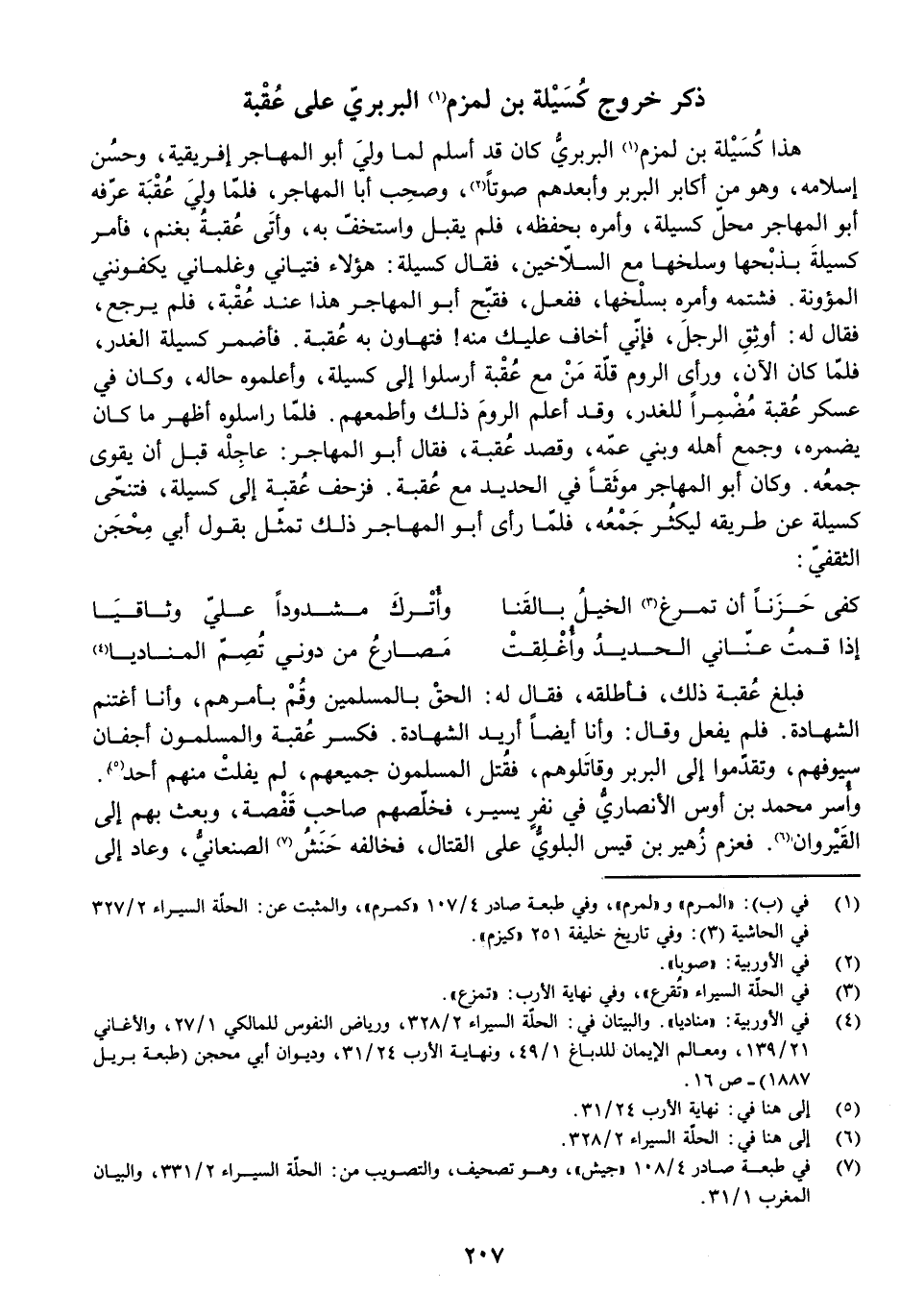 هَذَا كُسَيْلَةُ بْنُ لَمْزَمَ الْبَرْبَرِيُّ كَانَ قَدْ أَسْلَمَ لَمَّا وَلِيَ أَبُو الْمُهَاجِرِ إِفْرِيقِيَّةَ وَحَسُنَ إِسْلَامُهُ، وَهُوَ مِنْ أَكَابِرِ الْبَرْبَرِ وَأَبْعَدِهِمْ صَوْتًا، وَصَحِبَ أَبَا الْمُهَاجِرِ، فَلَمَّا وَلِيَ عُقْبَةُ عَرَّفَهُ أَبُو الْمُهَاجِرِ مَحَلَّ كُسَيْلَةَ وَأَمَرَهُ بِحِفْظِهِ فَلَمْ يَقْبَلْ وَاسْتَخَفَّ بِهِ، وَأَتَى عُقْبَةُ بِغَنَمٍ فَأَمَرَ كُسَيْلَةَ بِذَبْحِهَا وَسَلْخِهَا مَعَ السَّلَّاخِينَ.