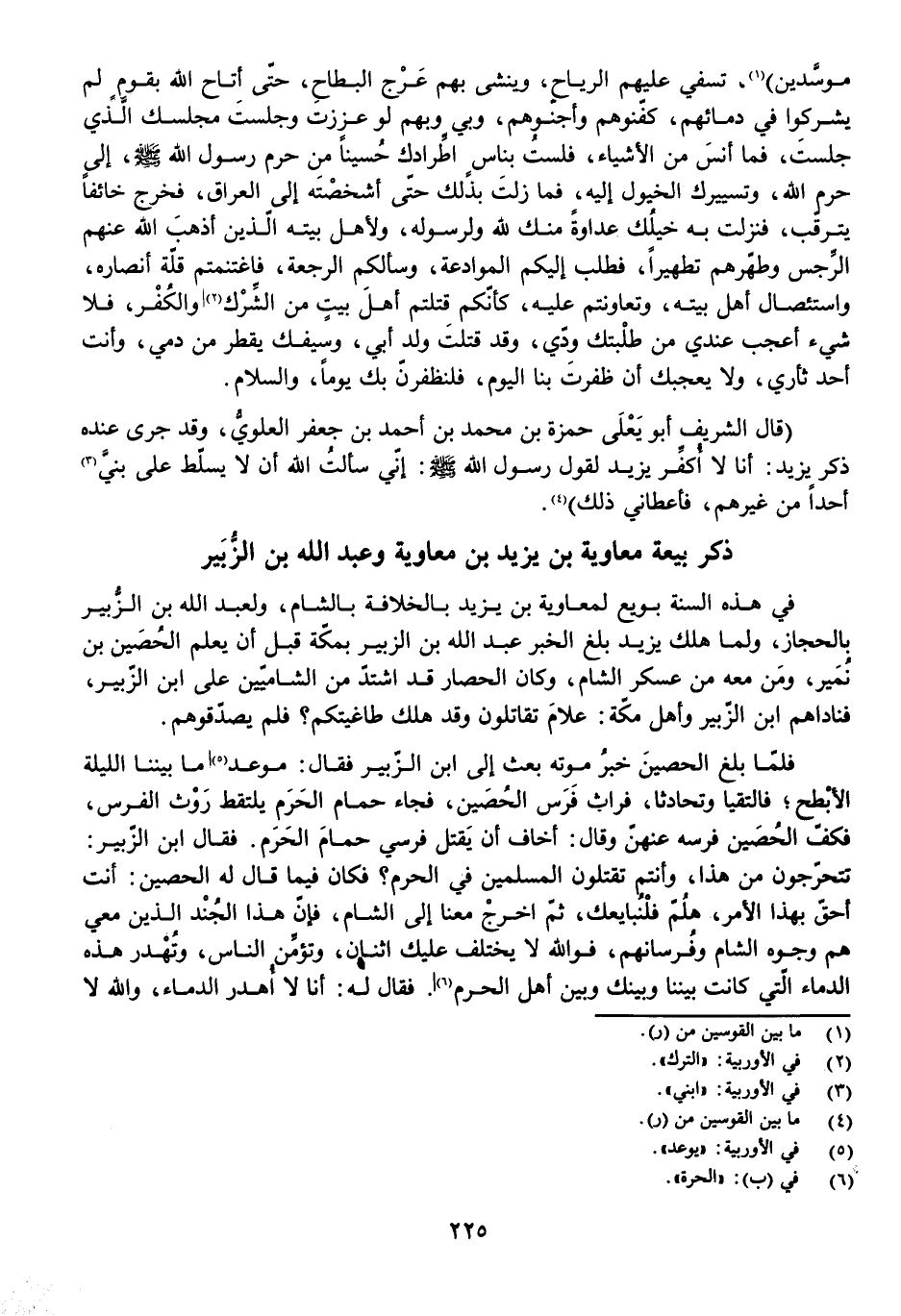 فَقَالَ ابْنُ الزُّبَيْرِ: تَتَحَرَّجُونَ مِنْ هَذَا وَأَنْتُمْ تَقْتُلُونَ الْمُسْلِمِينَ فِي الْحَرَمِ؟ فَكَانَ فِيمَا قَالَ لَهُ الْحُصَيْنُ: أَنْتَ أَحَقُّ بِهَذَا الْأَمْرِ، هَلُمَّ فَلْنُبَايِعْكَ ثُمَّ اخْرُجْ مَعَنَا إِلَى الشَّامِ، فَإِنَّ هَذَا الْجُنْدَ الَّذِينَ مَعِي هُمْ وُجُوهُ الشَّامِ وَفُرْسَانُهُمْ، فَوَاللَّهِ لَا يَخْتَلِفُ عَلَيْكَ اثْنَانِ وَتُؤَمِّنُ النَّاسَ وَتُهْدِرُ هَذِهِ الدِّمَاءَ الَّتِي كَانَتْ بَيْنَنَا وَبَيْنَكَ وَبَيْنَ أَهْلِ الْحَرَمِ.