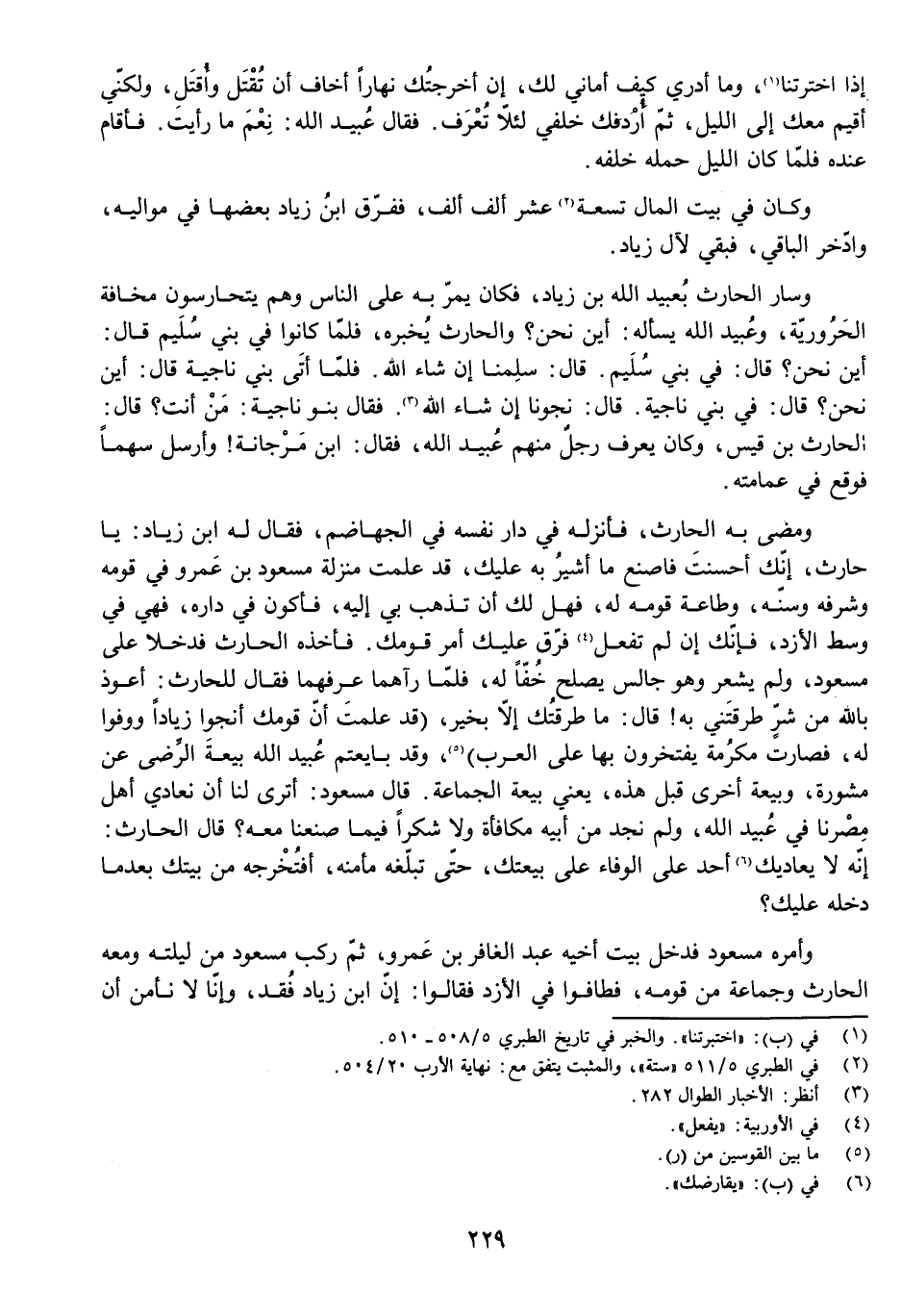 وَمَضَى بِهِ الْحَارِثُ فَأَنْزَلَهُ فِي دَارِ نَفْسِهِ فِي الْجَهَاضِمِ، فَقَالَ لَهُ ابْنُ زِيَادٍ: يَا حَارِثُ إِنَّكَ أَحْسَنْتَ فَاصْنَعْ مَا أُشِيرُ بِهِ عَلَيْكَ، قَدْ عَلِمْتَ مَنْزِلَةَ مَسْعُودِ بْنِ عَمْرٍو فِي قَوْمِهِ وَشَرَفِهِ وَسِنَّهُ وَطَاعَةَ قَوْمِهِ لَهُ، فَهَلْ لَكَ أَنْ تَذْهَبَ بِي إِلَيْهِ فَأَكُونَ فِي دَارِهِ فَهِيَ فِي وَسَطِ الْأَزْدِ، فَإِنَّكَ إِنْ لَمْ تَفْعَلْ فُرِّقَ عَلَيْكَ أَمْرُ قَوْمِكَ.