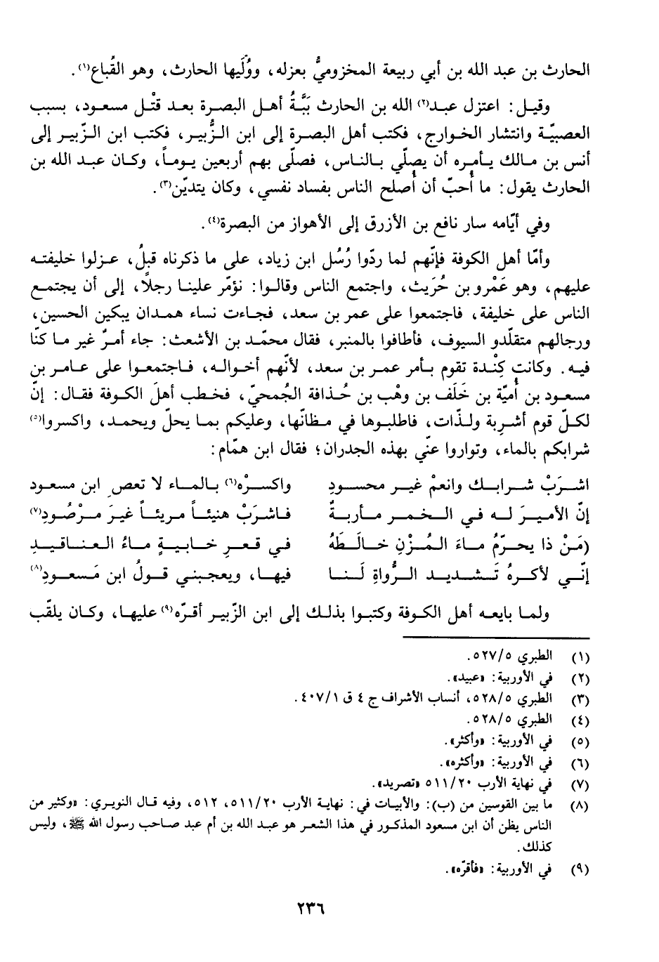 اشْرَبْ شَرَابَكَ وَانْعَمْ غَيْرَ مَحْسُودِ وَاكْسِرْهُ بِالْمَاءِ لَا تَعْصِ ابْنَ مَسْعُودِ إِنَّ الْأَمِيرَ لَهُ فِي الْخَمْرِ مَأْرَبَةٌ فَاشْرَبْ هَنِيئًا مَرِيئًا غَيْرَ مَرْصُودِ مَنْ ذَا يُحَرِّمُ مَاءَ الْمُزْنِ خَالَطَهُ فِي قَعْرِ خَابِيَةٍ مَاءُ الْعَنَاقِيدِ إِنِّي لَأَكْرَهُ تَشْدِيدَ الرُّوَاةِ لَنَا فِيهَا وَيُعْجِبُنِي قَوْلُ ابْنِ مَسْعُودِ وَلَمَّا بَايَعَهُ أَهْلُ الْكُوفَةِ وَكَتَبُوا بِذَلِكَ إِلَى ابْنِ الزُّبَيْرِ أَقَرَّهُ عَلَيْهَا، وَكَانَ يُلَقَّبُ
