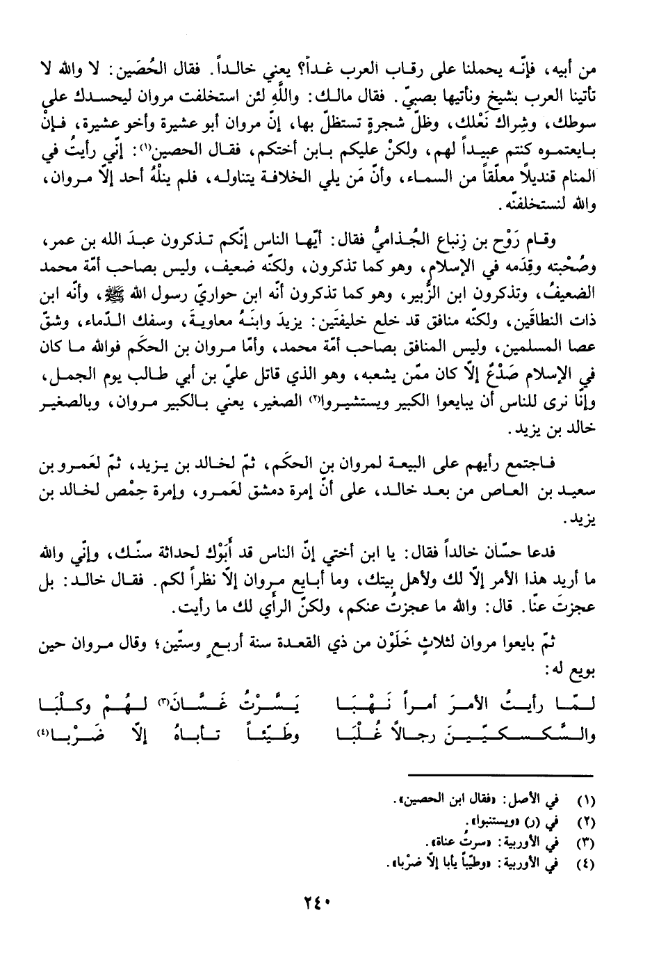 فَقَالَ مَالِكٌ: وَاللَّهِ لَئِنِ اسْتَخْلَفْتَ مَرْوَانَ لَيَحْسُدُكَ عَلَى سَوْطِكَ وَشِرَاكِ نَعْلِكَ وَظِلِّ شَجَرَةٍ تَسْتَظِلُّ بِهَا، إِنَّ مَرْوَانَ أَبُو عَشِيرَةٍ وَأَخُو عَشِيرَةٍ فَإِنْ بَايَعْتُمُوهُ كُنْتُمْ عَبِيدًا لَهُمْ، وَلَكِنْ عَلَيْكُمْ بِابْنِ أُخْتِكُمْ، فَقَالَ الْحُصَيْنُ: إِنِّي رَأَيْتُ فِي الْمَنَامِ قِنْدِيلًا مُعَلَّقًا مِنَ السَّمَاءِ وَأَنَّ مَنْ يَلِي الْخِلَافَةَ يَتَنَاوَلُهُ فَلَمْ يَنَلْهُ أَحَدٌ إِلَّا مَرْوَانَ، وَاللَّهِ لَنَسْتَخْلِفَنَّهُ.