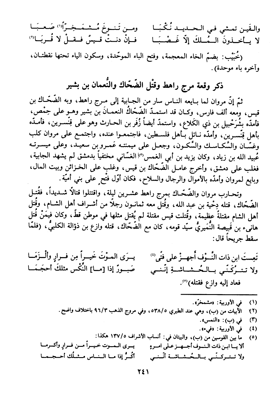 وَتَحَارَبَ مَرْوَانُ وَالضَّحَّاكُ بِمَرْجِ رَاهِطٍ عِشْرِينَ لَيْلَةً وَاقْتَتَلُوا قِتَالًا شَدِيدًا، فَقُتِلَ الضَّحَّاكُ، قَتَلَهُ دِحْيَةُ بْنُ عَبْدِ اللَّهِ، وَقُتِلَ مَعَهُ ثَمَانُونَ رَجُلًا مِنْ أَشْرَافِ أَهْلِ الشَّامِ، وَقُتِلَ أَهْلُ الشَّامِ مَقْتَلَةً عَظِيمَةً، وَقُتِلَتْ قَيْسٌ مَقْتَلَةً لَمْ يُقْتَلْ مِثْلَهَا فِي مَوْطِنٍ قَطُّ، وَكَانَ فِيمَنْ قُتِلَ هَانِئُ بْنُ قَبِيصَةَ النُّمَيْرِيُّ سَيِّدُ قَوْمِهِ، كَانَ مَعَ الضَّحَّاكِ، قَتَلَهُ وَازِعُ بْنُ ذُؤَالَةَ الْكَلْبِيُّ، (فَلَمَّا سَقَطَ جَرِيحًا قَالَ: