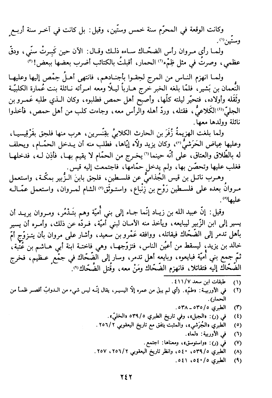 وَقِيلَ: إِنَّ عُبَيْدَ اللَّهِ بْنَ زِيَادٍ إِنَّمَا جَاءَ إِلَى بَنِي أُمَيَّةَ وَهُمْ بِتَدْمُرَ، وَمَرْوَانُ يُرِيدُ أَنْ يَسِيرَ إِلَى ابْنِ الزُّبَيْرِ لِيُبَايِعَهُ وَيَأْخُذَ مِنْهُ الْأَمَانَ لِبَنِي أُمَيَّةَ، فَرَدَّهُ عَنْ ذَلِكَ وَأَمَرَهُ أَنْ يَسِيرَ بِأَهْلِ تَدْمُرَ إِلَى الضَّحَّاكِ فَيُقَاتِلَهُ، وَوَافَقَهُ عَمْرُو بْنَ سَعِيدٍ وَأَشَارَ عَلَى مَرْوَانَ بِأَنْ يَتَزَوَّجَ أُمَّ خَالِدِ بْنِ يَزِيدَ لِيَسْقُطَ مِنْ أَعْيُنِ النَّاسِ فَتَزَوَّجَهَا، وَهِيَ فَاخِتَةُ ابْنَةُ أَبِي هَاشِمِ بْنِ عُتْبَةَ، ثُمَّ جَمَعَ بَنِي أُمَيَّةَ فَبَايَعُوهُ وَبَايَعَهُ أَهْلُ تَدْمُرَ، وَسَارَ إِلَى الضَّحَّاكِ فِي جَمْعٍ عَظِيمٍ، فَخَرَجَ الضَّحَّاكُ إِلَيْهِ فَتَقَاتَلَا فَانْهَزَمَ الضَّحَّاكُ وَمَنْ مَعَهُ وَقُتِلَ الضَّحَّاكُ.