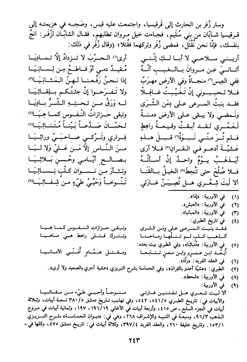 وَسَارَ زُفَرُ بْنُ الْحَارِثِ إِلَى قَرْقِيسْيَا، وَاجْتَمَعَتْ عَلَيْهِ قَيْسٌ، وَصَحِبَهُ فِي هَزِيمَتِهِ إِلَى قَرْقِيسْيَا شَابَّانِ مِنْ بَنِي سُلَيْمٍ، فَجَاءَتْ خَيْلُ مَرْوَانَ تَطْلُبُهُمْ، فَقَالَ الشَّابَّانِ لِزُفَرَ: انْجُ بِنَفْسِكَ فَإِنَّا نَحْنُ نُقْتَلُ، فَمَضَى زُفَرُ وَتَرَكَهُمَا فَقُتِلَا، (وَقَالَ زُفَرُ فِي ذَلِكَ: