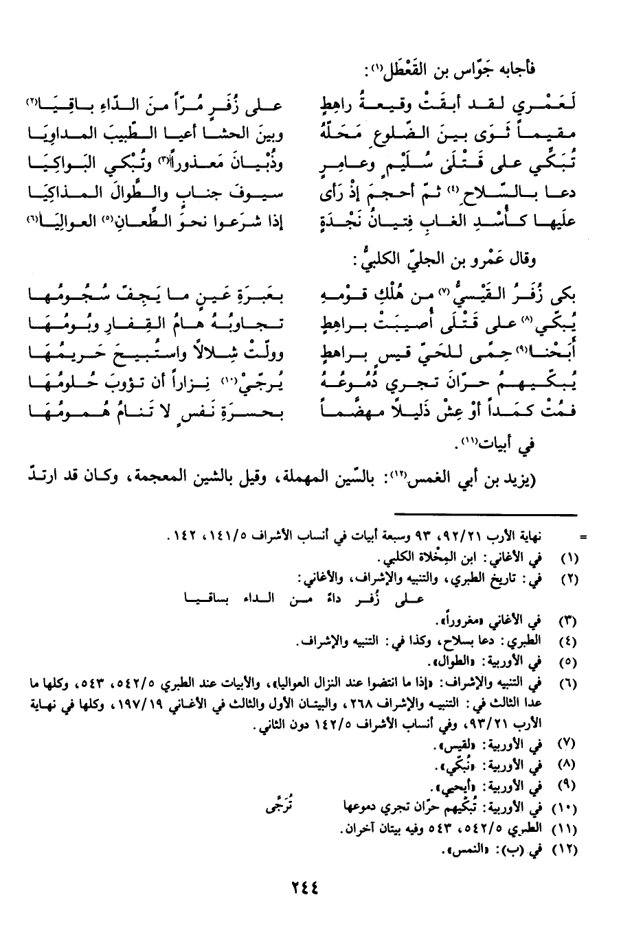 بَكَى زُفَرُ الْقَيْسِيُّ مِنْ هُلْكِ قَوْمِهِ ... بِعَبْرَةِ عَيْنٍ مَا يَجِفُّ سُجُومُهَا