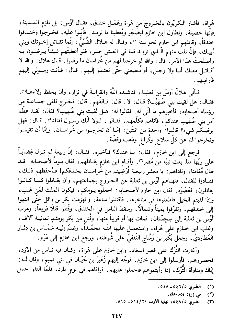 فَاقْتَتَلُوا سَاعَةً وَانْهَزَمَتْ بَكْرُ بْنُ وَائِلٍ حَتَّى انْتَهَوْا إِلَى خَنْدَقِهِمْ وَتَفَرَّقُوا يَمِينًا وَشِمَالًا وَسَقَطَ النَّاسُ فِي الْخَنْدَقِ وَقُتِلُوا قَتْلًا ذَرِيعًا وَهَرَبَ أَوْسُ بْنُ ثَعْلَبَةَ إِلَى سِجِسْتَانَ فَمَاتَ بِهَا أَوْ قَرِيبًا مِنْهَا، وَقُتِلَ مِنْ بَكْرٍ يَوْمَئِذٍ ثَمَانِيَةُ آلَافٍ، وَغَلَبَ ابْنُ خَازِمٍ عَلَى هَرَاةَ وَاسْتَعْمَلَ عَلَيْهَا ابْنَهُ مُحَمَّدًا وَضَمَّ إِلَيْهِ شَمَّاسَ بْنَ دِثَارٍ الْعُطَارِدِيَّ، وَجَعَلَ بُكَيْرَ بَنَ وَسَّاجٍ الثَّقَفِيَّ عَلَى شُرْطَتِهِ وَرَجَعَ ابْنُ خَازِمٍ إِلَى مَرْوَ.