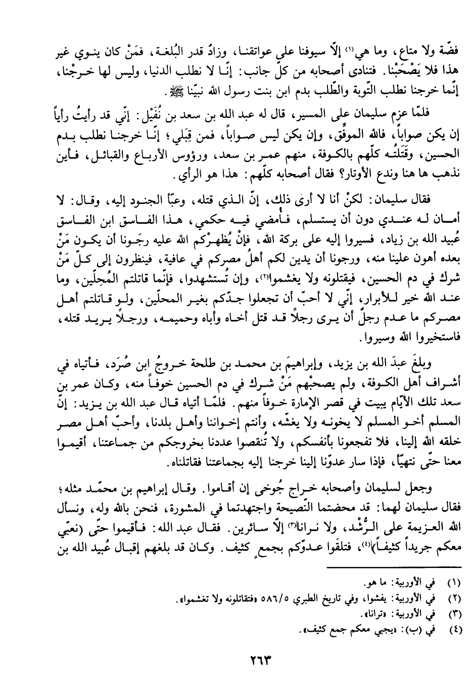 فَقَالَ سُلَيْمَانُ: لَكِنْ أَنَا لَا أَرَى ذَلِكَ، إِنَّ الَّذِي قَتَلَهُ وَعَبَّأَ الْجُنُودَ إِلَيْهِ وَقَالَ لَا أَمَانَ لَهُ عِنْدِي دُونَ أَنْ يَسْتَسْلِمَ فَأُمْضِي فِيهِ حُكْمِي، هَذَا الْفَاسِقُ ابْنُ الْفَاسِقِ عُبَيْدُ اللَّهِ بْنُ زِيَادٍ، فَسِيرُوا إِلَيْهِ عَلَى بَرَكَةِ اللَّهِ فَإِنْ يُظْهِرْكُمُ اللَّهُ عَلَيْهِ رَجَوْنَا أَنْ يَكُونَ مَنْ بَعْدَهُ أَهْوَنَ عَلَيْنَا مِنْهُ، وَرَجَوْنَا أَنْ يَدِينَ لَكُمْ أَهْلُ مِصْرِكُمْ فِي عَافِيَةٍ فَيَنْظُرُونَ إِلَى كُلِّ مَنْ شَرَكَ فِي دَمِ الْحُسَيْنِ فَيَقْتُلُونَهُ وَلَا يَغْشِمُوا، وَإِنْ تُسْتَشْهَدُوا فَإِنَّمَا قَاتَلْتُمُ الْمُحِلِّينَ، وَمَا عِنْدَ اللَّهِ خَيْرٌ لِلْأَبْرَارِ، إِنِّي لَا أُحِبُّ أَنْ تَجْعَلُوا جِدَّكُمْ بِغَيْرِ الْمُحِلِّينَ، وَلَوْ قَاتَلْتُمْ أَهْلَ مِصْرِكُمْ مَا عَدَمَ رَجُلٌ أَنْ يَرَى رَجُلًا قَدْ قَتَلَ أَخَاهُ وَأَبَاهُ وَحَمِيمَهُ وَرَجُلًا يُرِيدُ قَتْلَهُ، فَاسْتَخِيرُوا اللَّهَ وَسِيرُوا.