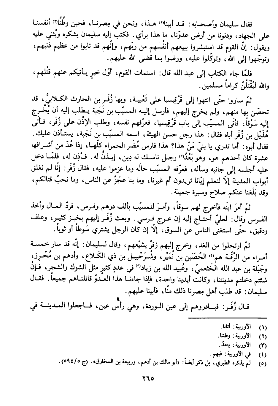 ثُمَّ ارْتَحَلُوا مِنَ الْغَدِ، وَخَرَجَ إِلَيْهِمْ زُفَرُ يُشَيِّعُهُمْ وَقَالَ لِسُلَيْمَانَ: إِنَّهُ قَدْ سَارَ خَمْسَةُ أُمَرَاءَ مِنَ الرَّقَّةِ هُمُ الْحُصَيْنُ بْنُ نُمَيْرٍ، وَشُرَحْبِيلُ بْنُ ذِي الْكَلَاعِ، وَأَدْهَمُ بْنُ مُحْرِزٍ، وَجَبَلَةُ بْنُ عَبْدِ اللَّهِ الْخَثْعَمِيُّ، وَعُبَيْدُ اللَّهِ بْنُ زِيَادٍ، فِي عَدَدٍ كَثِيرٍ مِثْلِ الشَّوْكِ وَالشَّجَرِ، فَإِنْ شِئْتُمْ دَخَلْتُمْ مَدِينَتَنَا وَكَانَتْ أَيْدِينَا وَاحِدَةً، فَإِذَا جَاءَنَا هَذَا الْعَدُوُّ قَاتَلْنَاهُمْ جَمِيعًا.