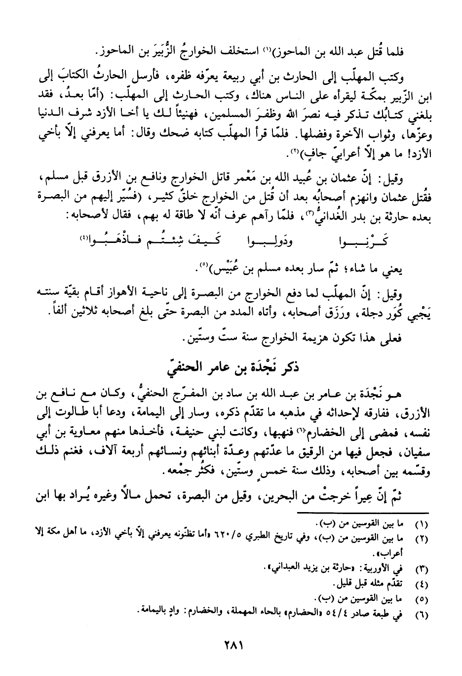 هُوَ نَجْدَةُ بْنُ عَامِرِ بْنِ عَبْدِ اللَّهِ بْنِ سَادِ بْنِ الْمُفَرِّجِ الْحَنَفِيُّ، وَكَانَ مَعَ نَافِعِ بْنِ الْأَزْرَقِ، فَفَارَقَهُ لِإِحْدَاثِهِ فِي مَذْهَبِهِ مَا تَقَدَّمَ ذِكْرُهُ، وَسَارَ إِلَى الْيَمَامَةِ، وَدَعَا أَبَا طَالُوتَ إِلَى نَفْسِهِ، فَمَضَى إِلَى الْحَضَارِمِ فَنَهَبَهَا، وَكَانَتْ لِبَنِي حَنِيفَةَ، فَأَخَذَهَا مِنْهُمْ مُعَاوِيَةُ بْنُ أَبِي سُفْيَانَ فِيهَا مِنَ الرَّقِيقِ مَا عِدَّتُهُمْ وَعِدَّةُ أَبْنَائِهِمْ وَنِسَائِهِمْ أَرْبَعَةُ آلَافٍ، فَغَنِمَ ذَلِكَ وَقَسَّمَهَ بَيْنَ أَصْحَابِهِ، وَذَلِكَ سَنَةَ خَمْسٍ وَسِتِّينَ فَكَثُرَ جَمْعُهُ.